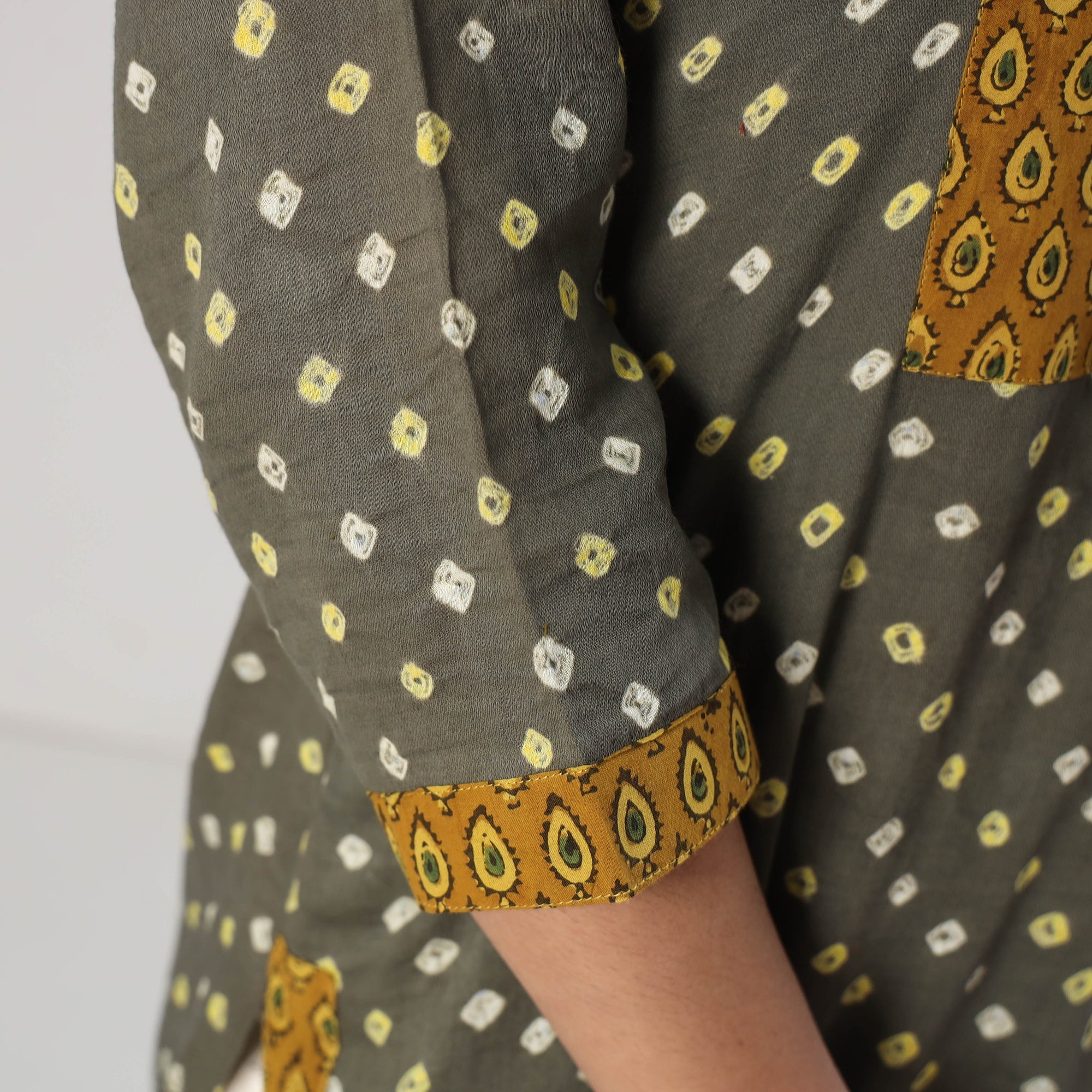Look and feel beautiful in this uniquely designed bandhani tie-dye cotton long kurta with ajrakh cotton patch and one side pocket. This cotton kurta makes you comfortable with ease all day long. This kurta is perfect for your daily outing and for a special occasion. Bandhani is a tie-dye soft cotton fabric, featuring majestic bandhani pattern, tie & dyed using the traditional technique practised by skilled artisans and their families in Kutch.