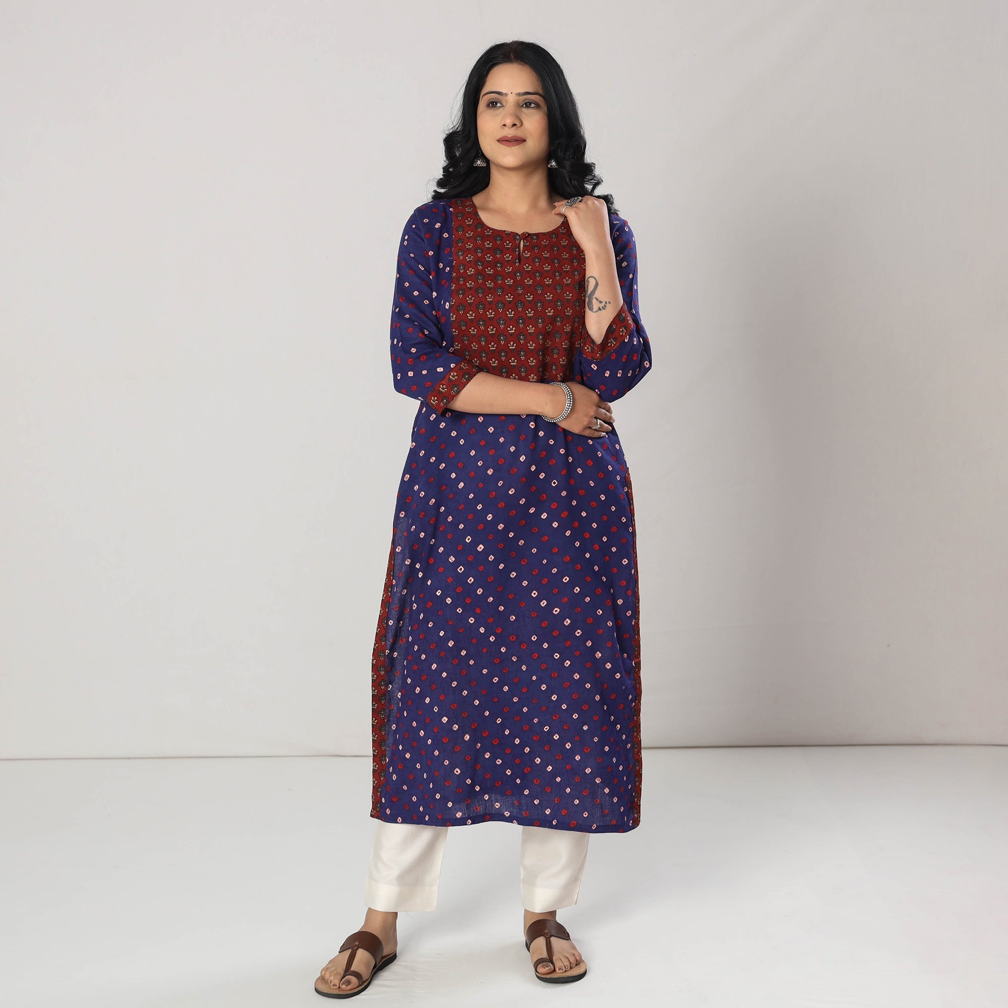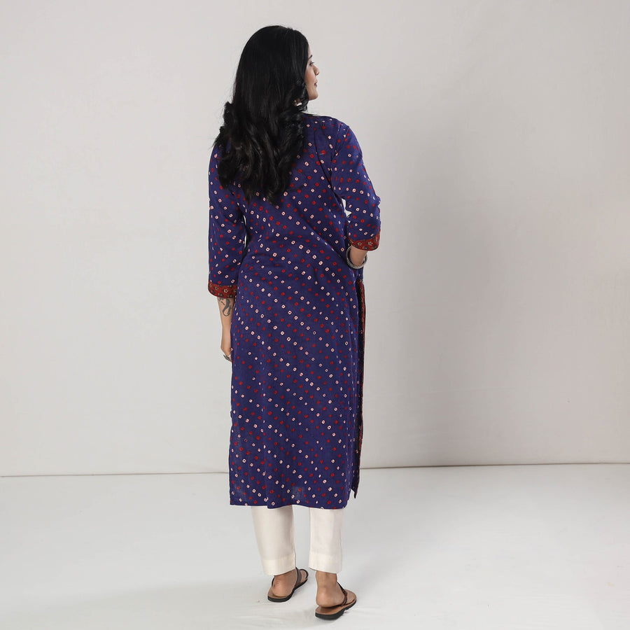 Look and feel beautiful in this uniquely designed bandhani tie-dye cotton long kurti with ajrakh cotton patch and one side pocket. This cotton kurti makes you comfortable with ease all day long. This kurti is perfect for your daily outing and for a special occasion. Bandhani is a tie-dye soft cotton fabric, featuring majestic bandhani pattern, tie & dyed using the traditional technique practised by skilled artisans and their families in Kutch.