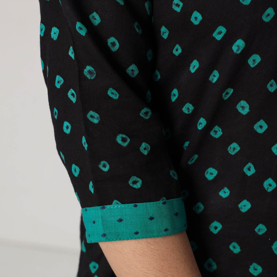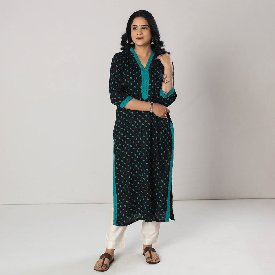 Look and feel beautiful in this uniquely designed bandhani tie-dye cotton long Kurta with Jacquard cotton patch and one side pocket. This cotton Kurta makes you comfortable with ease all day long. This Kurta is perfect for your daily outing and for a special occasion. Bandhani is a tie-dye soft cotton fabric, featuring majestic bandhani pattern, tie & dyed using the traditional technique practised by skilled artisans and their families in Kutch.