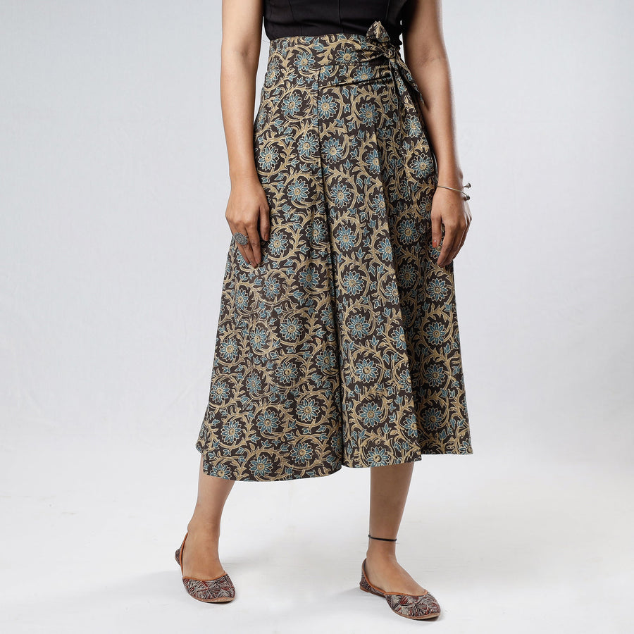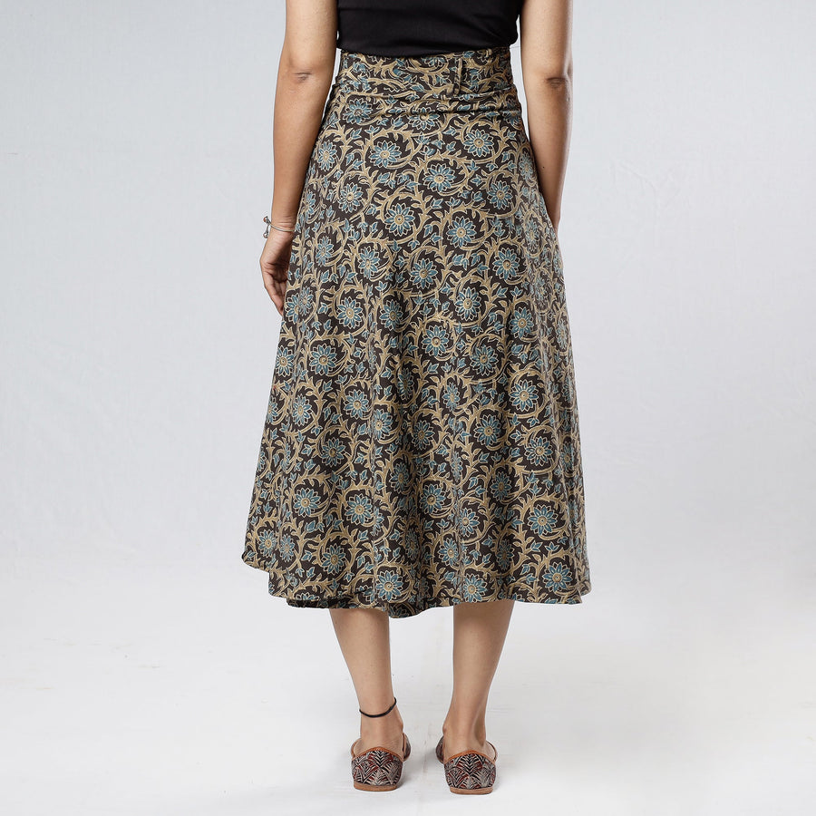Fine quality brown ajrakh block printing cotton wrap around skirt featuring a waist tie up closure, made using natural dyes through traditional ajrakh technique of hand-block printing practised by the master artisans in Kutch region of Gujarat.