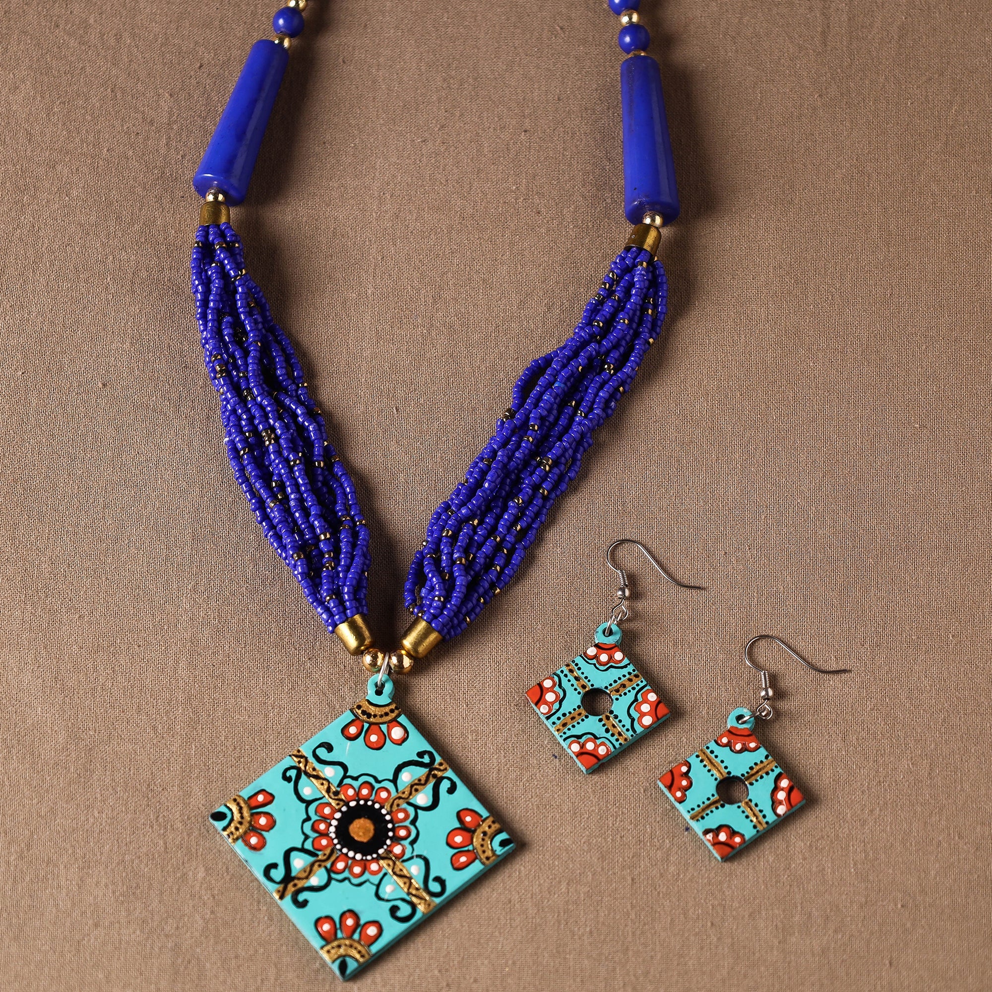 Beautifully green handcrafted necklace set made of mdf wood with tikuli handpainted miniature painting on both sides. (oil colours used) Can match any type of outfit.