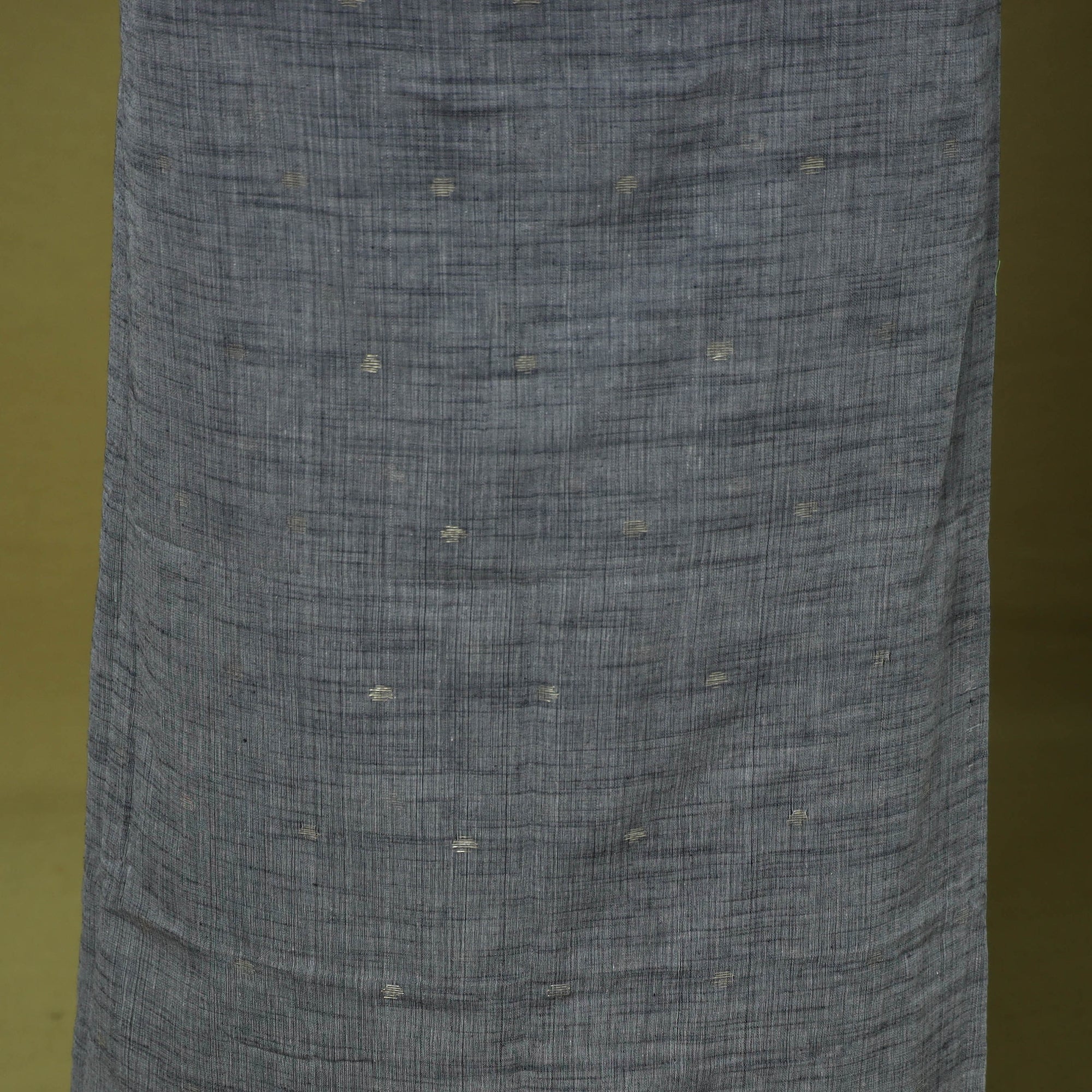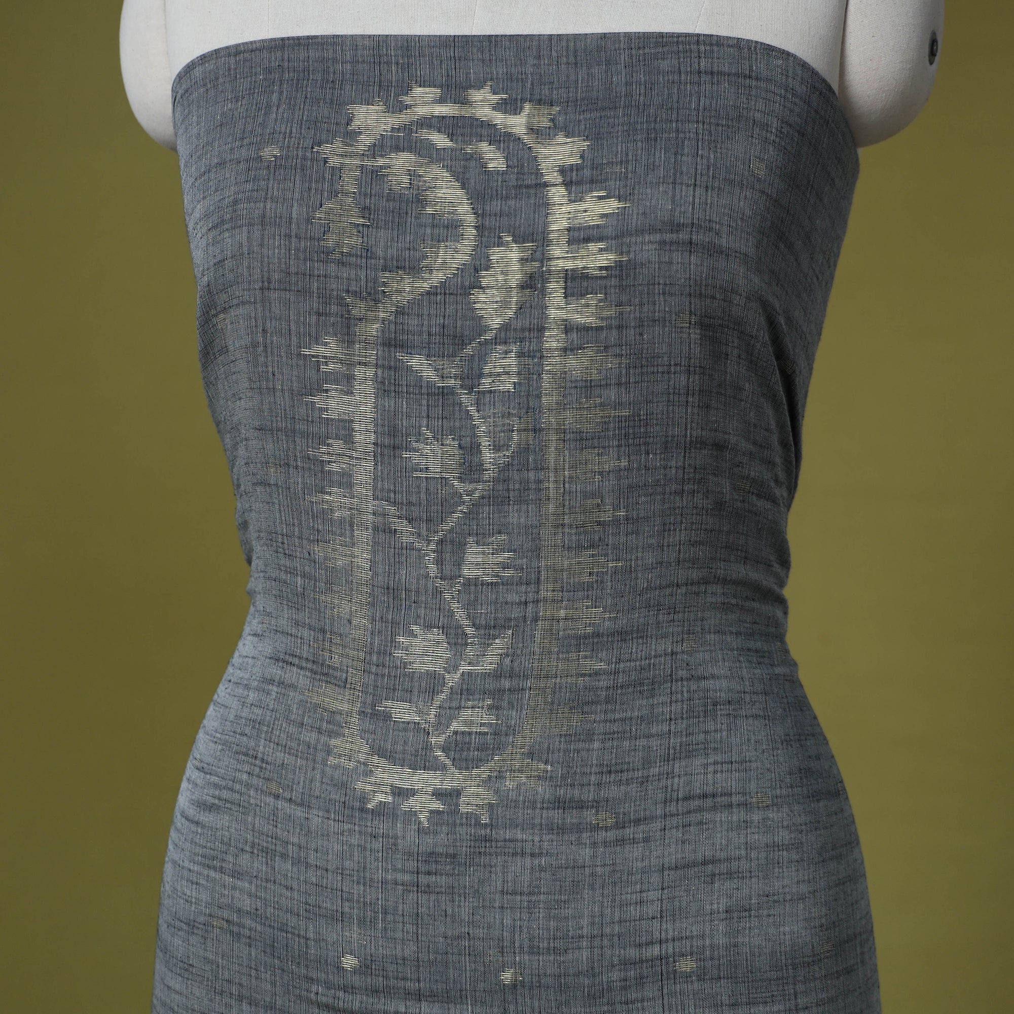 Fine quality grey phulia jamdani weave handloom cotton kurta material. Jamdani (extra weft) weaving, a style unique to Bengal…literally like “hand embroidery” on the loom. The method of weaving resembles tapestry work in which small shuttles of coloured, gold or silver threads, are passed through the warp. Jamdani, because of its intricate patterns, has always been a highly expensive product. The process is extremely time consuming as it involves a tedious form of hand looming.
