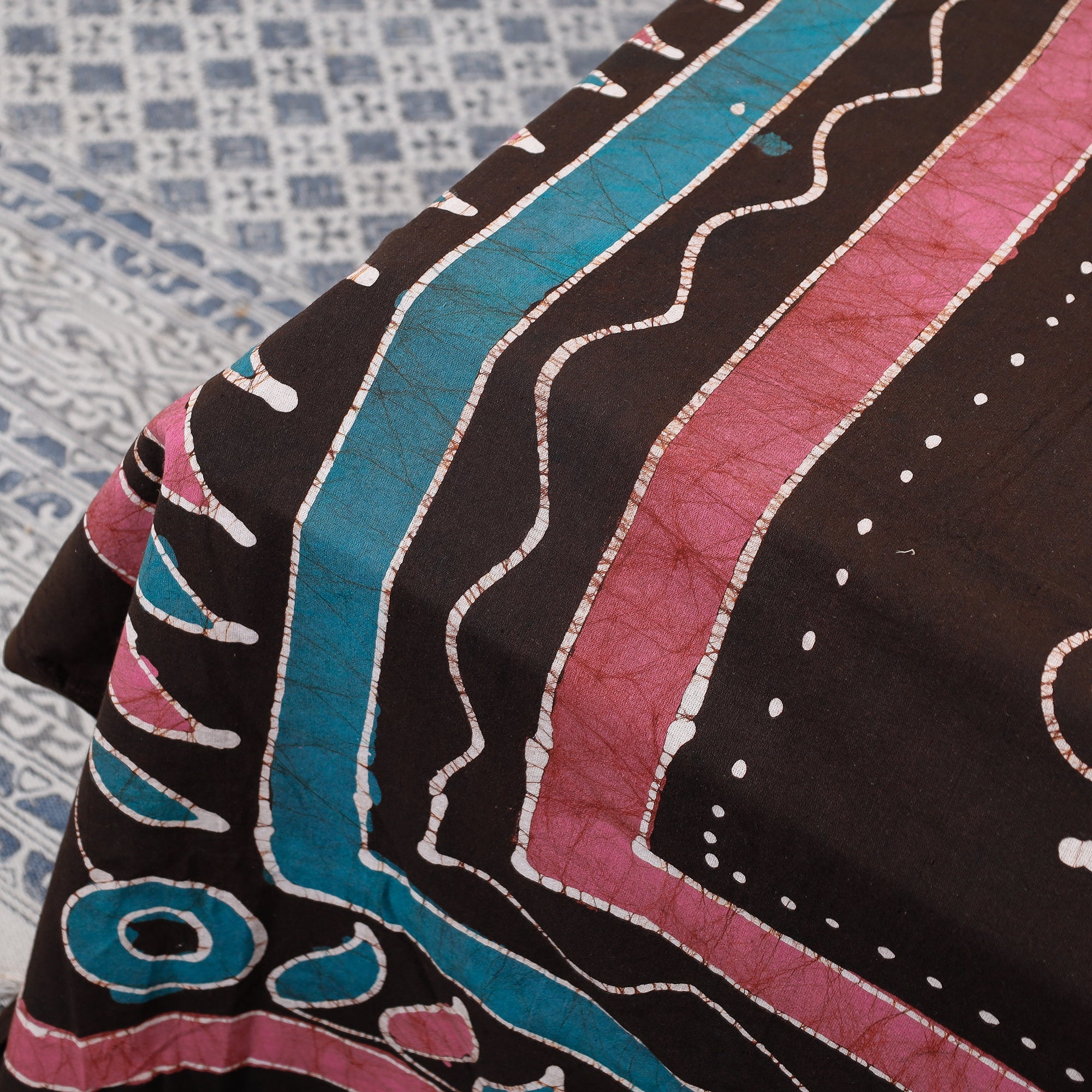 Hand batik printed cotton double bed cover with pillow covers from Ujjain, Madhya Pradesh. Batik is a technique of wax-resist dyeing applied to whole cloth, or cloth made using this technique. The traditional designs and motifs in Indian batik are often passed down from one generation to another.