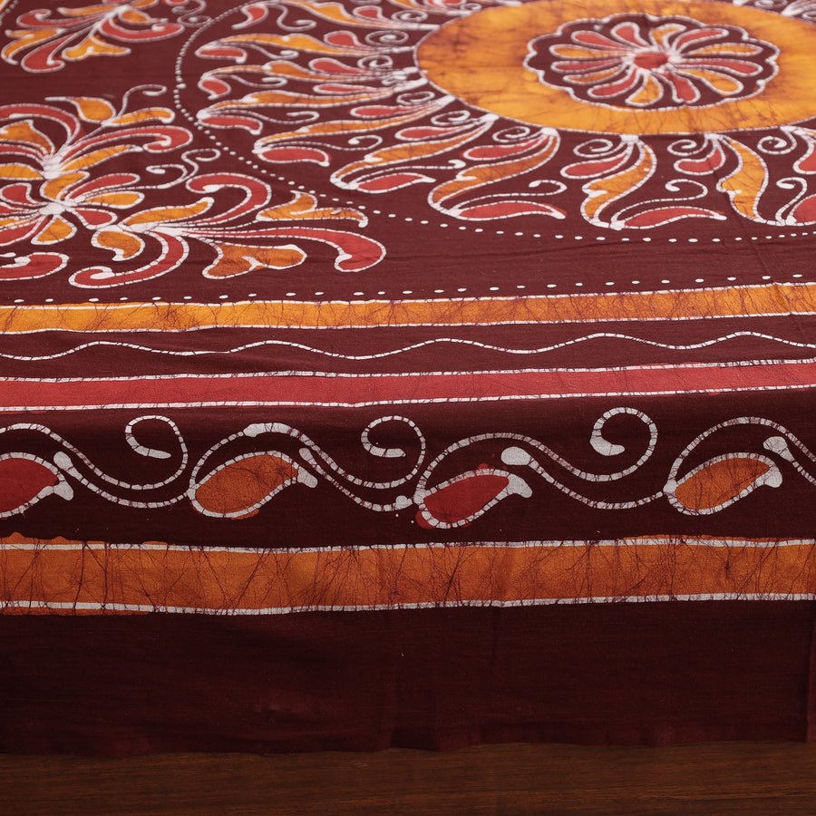 Hand batik printed cotton double bed cover with pillow covers from Ujjain, Madhya Pradesh. Batik is a technique of wax-resist dyeing applied to whole cloth, or cloth made using this technique. The traditional designs and motifs in Indian batik are often passed down from one generation to another.
