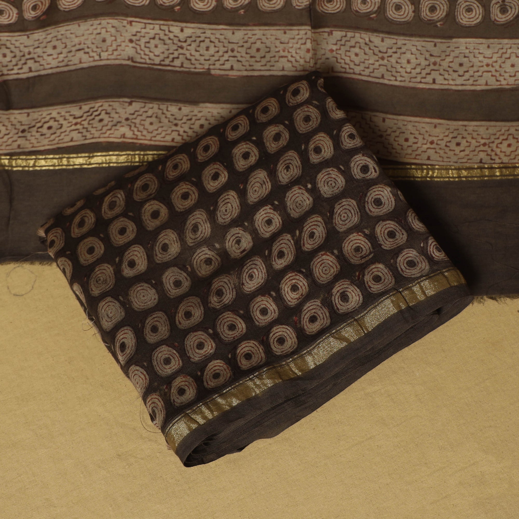 Fine quality akola hand block printed 3pc chanderi silk suit material set with zari border, made using natural dyes through traditional process of hand block printing practised by the master artisans in Akola village of Rajasthan. Chanderi silks are known for its gossamer looks and amazing feel.