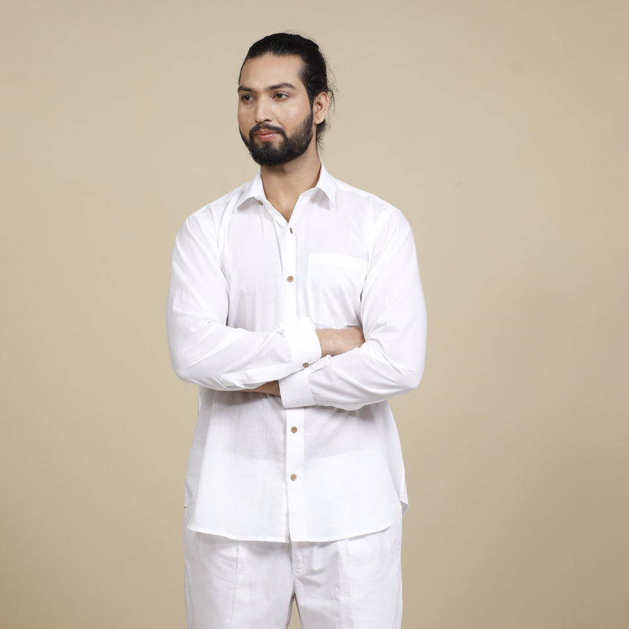 Fine quality white plain cotton men's shirt with one chest pocket, makes you comfortable with ease all day long. It's made from cotton fabric and features full sleeves and a front button placket. This casual shirt is perfect for your daily outing and for a special occasion.