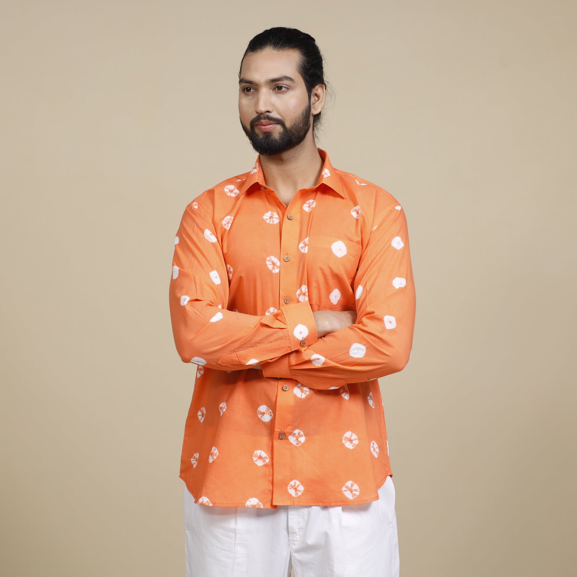 Fine quality shibori tie-dye pure cotton full sleeve shirt with regular collar for men. Shibori tie and dye technique in which the fabric is tied using clamp or stitches in the required design and the pattern is dyed. Bleed free VAT dyes used.