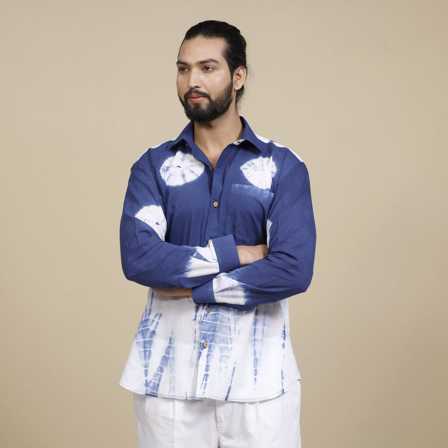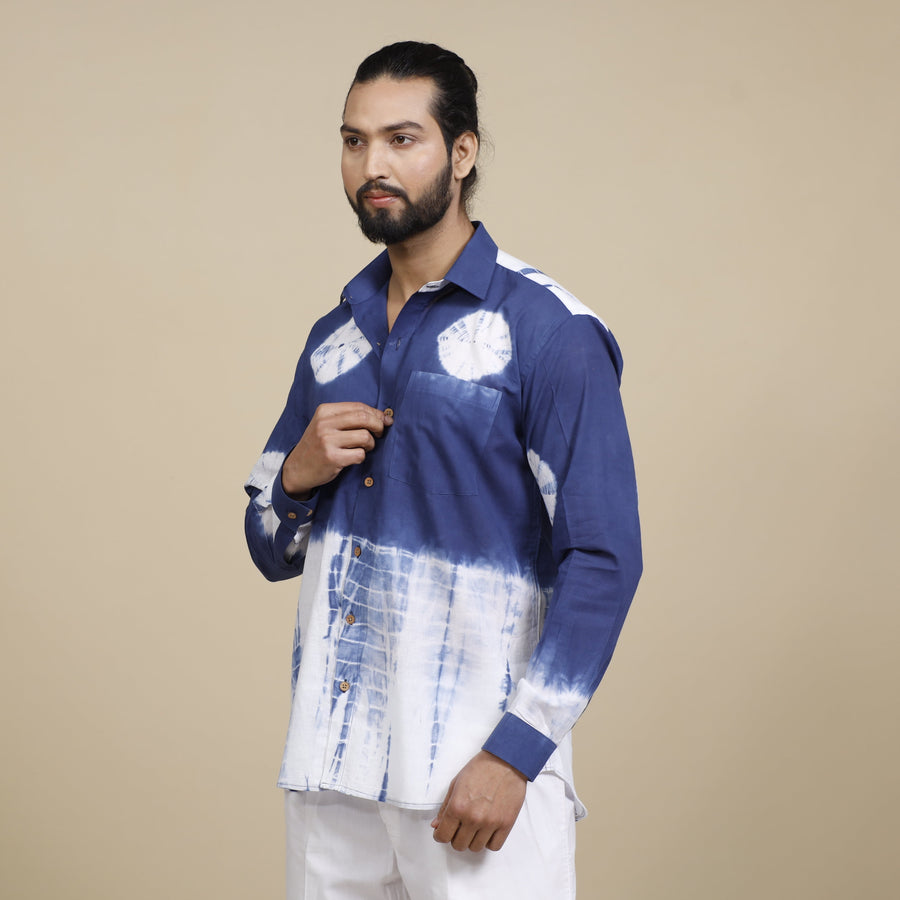 Fine quality shibori tie-dye pure cotton full sleeve shirt with regular collar for men. Shibori tie and dye technique in which the fabric is tied using clamp or stitches in the required design and the pattern is dyed. Bleed free VAT dyes used.