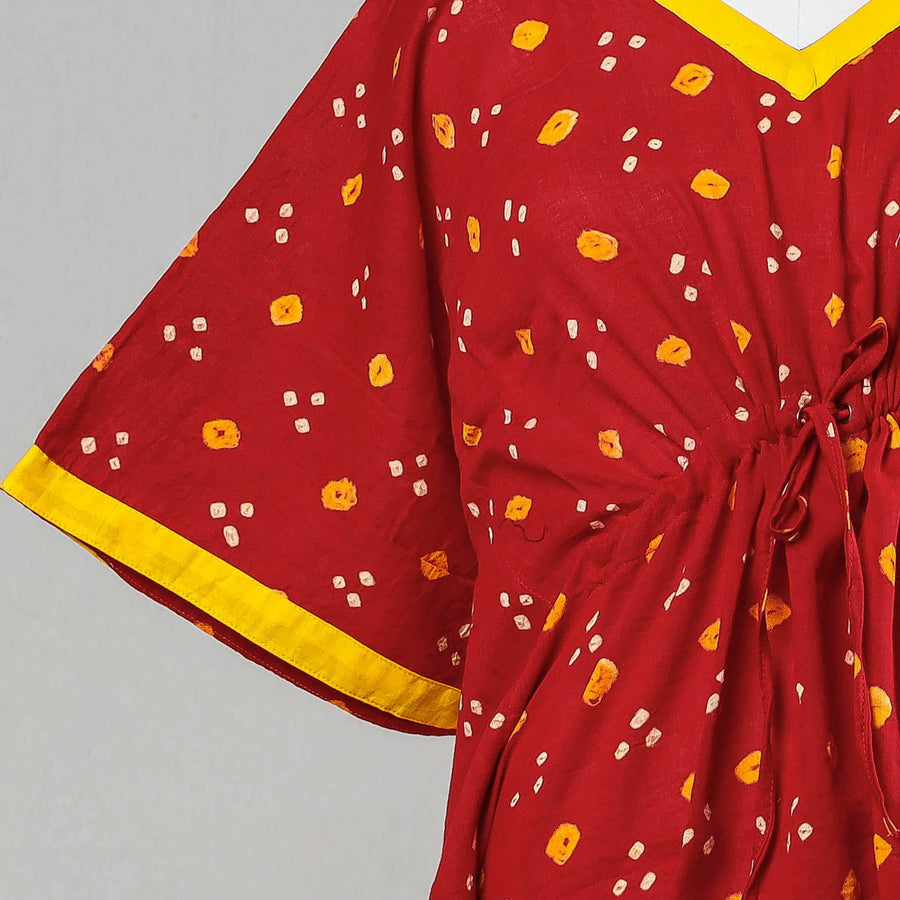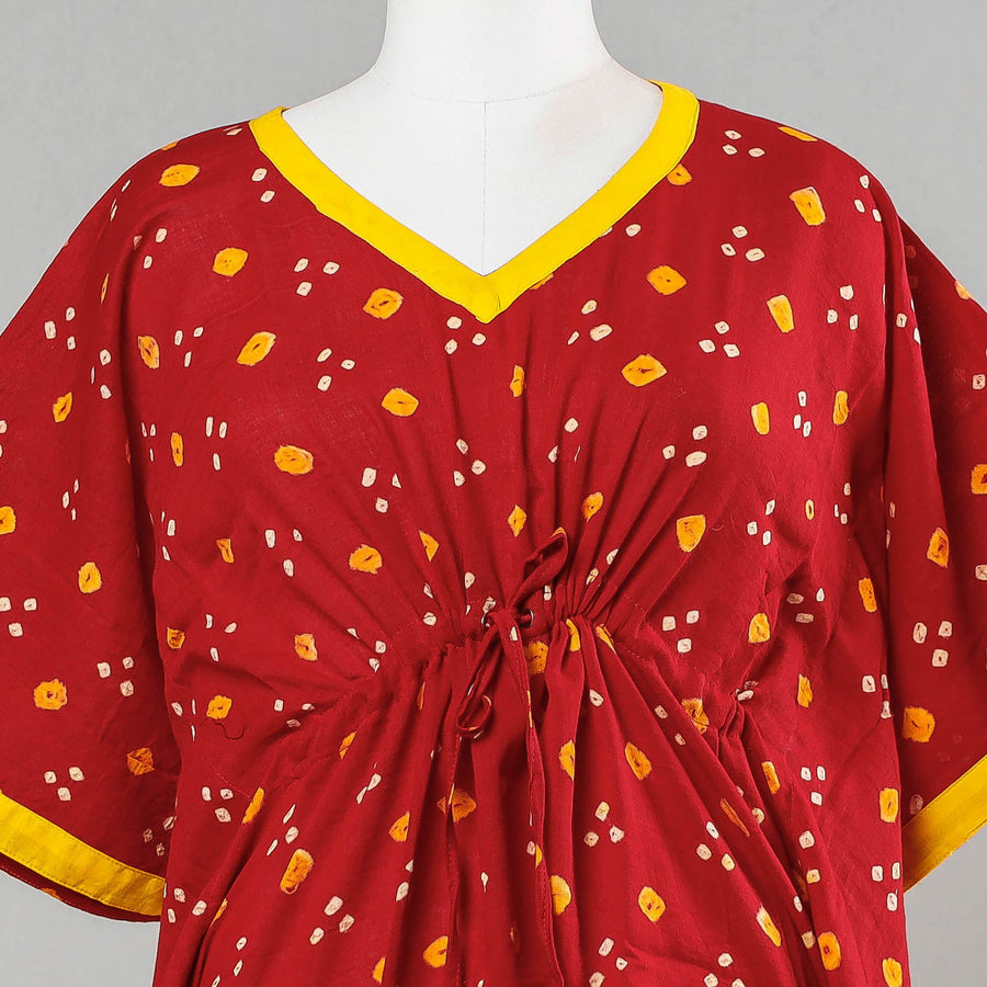 Fine quality bandhani tie-dye cotton short kaftan featuring majestic bandhani pattern, tie-dyed using the traditional technique practised by the artisans of Kutch. The art of Bandhani is highly skilled process. The technique involves dyeing a fabric which is tied tightly with a thread at several points. A traditional kaftan or caftan is an short length garment with long, flowing sleeves. It has an adjustable drawstring waist. These loose-fitting cotton kaftans are enhanced by a soft touch and beautiful hand prints. This dress will allow you to move with ease and comfort. The drawstring waist tie will give you the freedom to customize the fit to suit your unique shape.