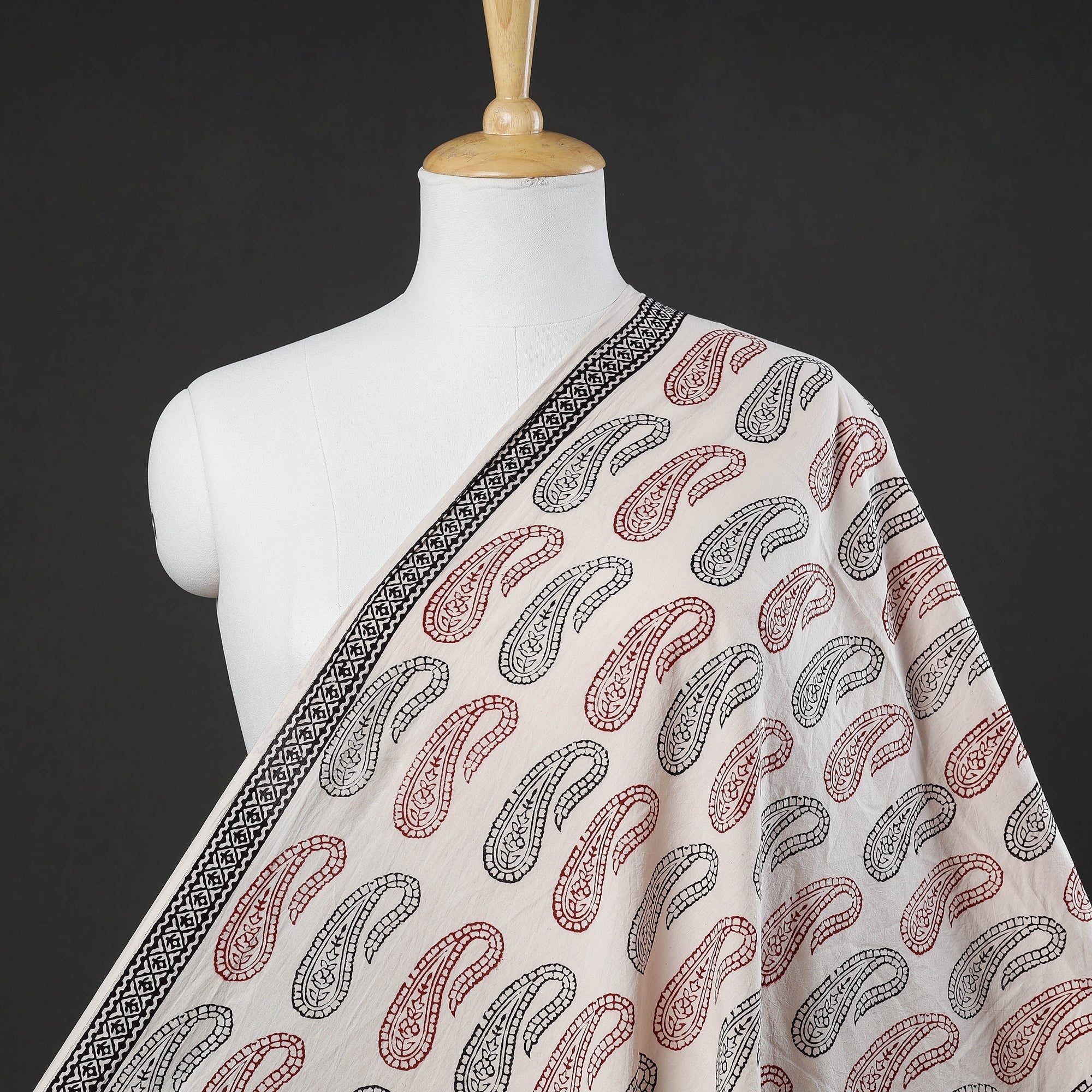 Bagh layouts are dramatic with the use of black and red alternately on a white background. Its production process is manually painstaking. Though the techniques and designs are age-old the prints retain their contemporary appeal.
