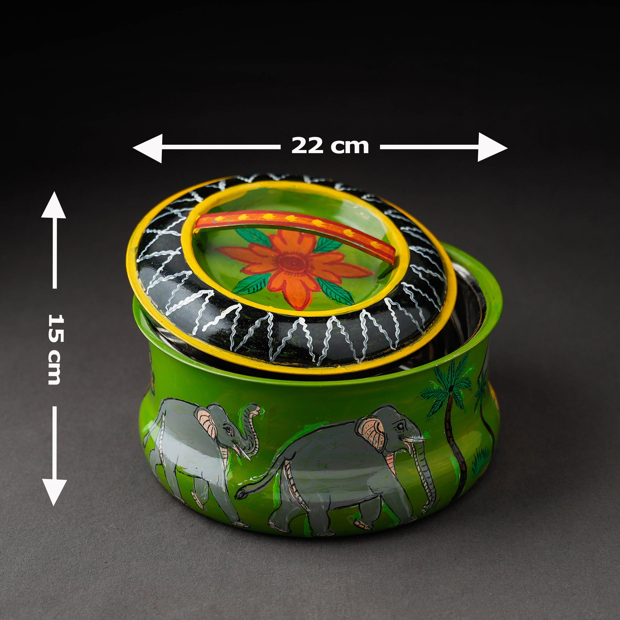 Green kavad handpainted stainless steel casserole with waterproof acrylic color on very high quality stainless steel by the artisans of Mewar, Rajasthan. This casserole can be used daily in the kitchen.