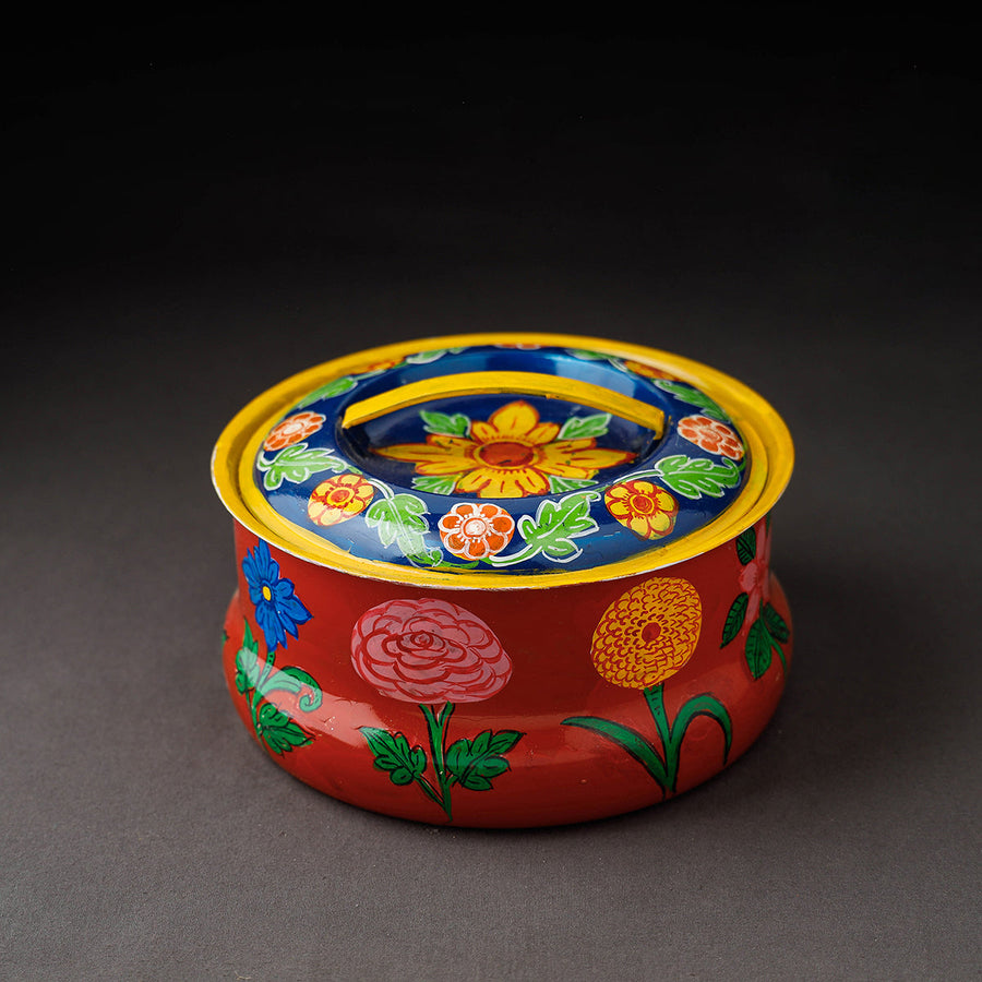 Red kavad handpainted stainless steel casserole with waterproof acrylic color on very high quality stainless steel by the artisans of Mewar, Rajasthan. This casserole can be used daily in the kitchen.