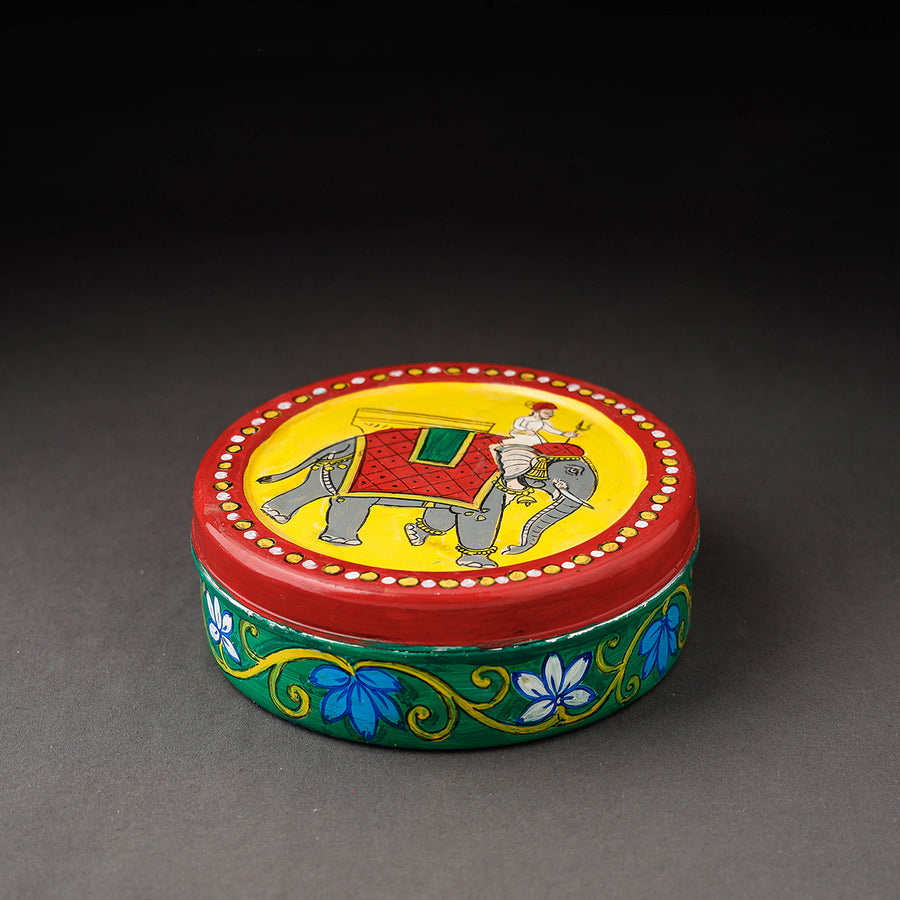 Multicolor kavad handpainted stainless steel masala box with waterproof acrylic color on very high quality stainless steel by the artisans of Mewar, Rajasthan. It has inner steel lid with seven small masala containers (for spices) & one small spoon inside. This masala box can be used in kitchen daily.