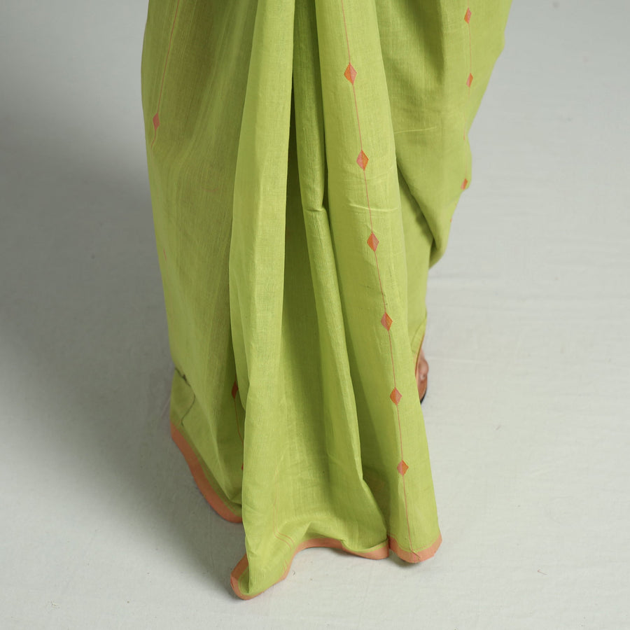 Fine quality jamdani buti handloom cotton saree with tassels made using azo free dye colours from the Srikakulam District of Andhra Pradesh. The handloom experience (soft, comfortable and durable) is due to the human handling of the yarn in the weaving process. As a result, yarn and the fabric are much less stressed and damaged. Hand woven cotton is known for its breathability as compared to mill made cotton. This implies that it allows more air penetration making it cooler, softer and more absorbent. It keeps you cooler in summers and warm in winters.