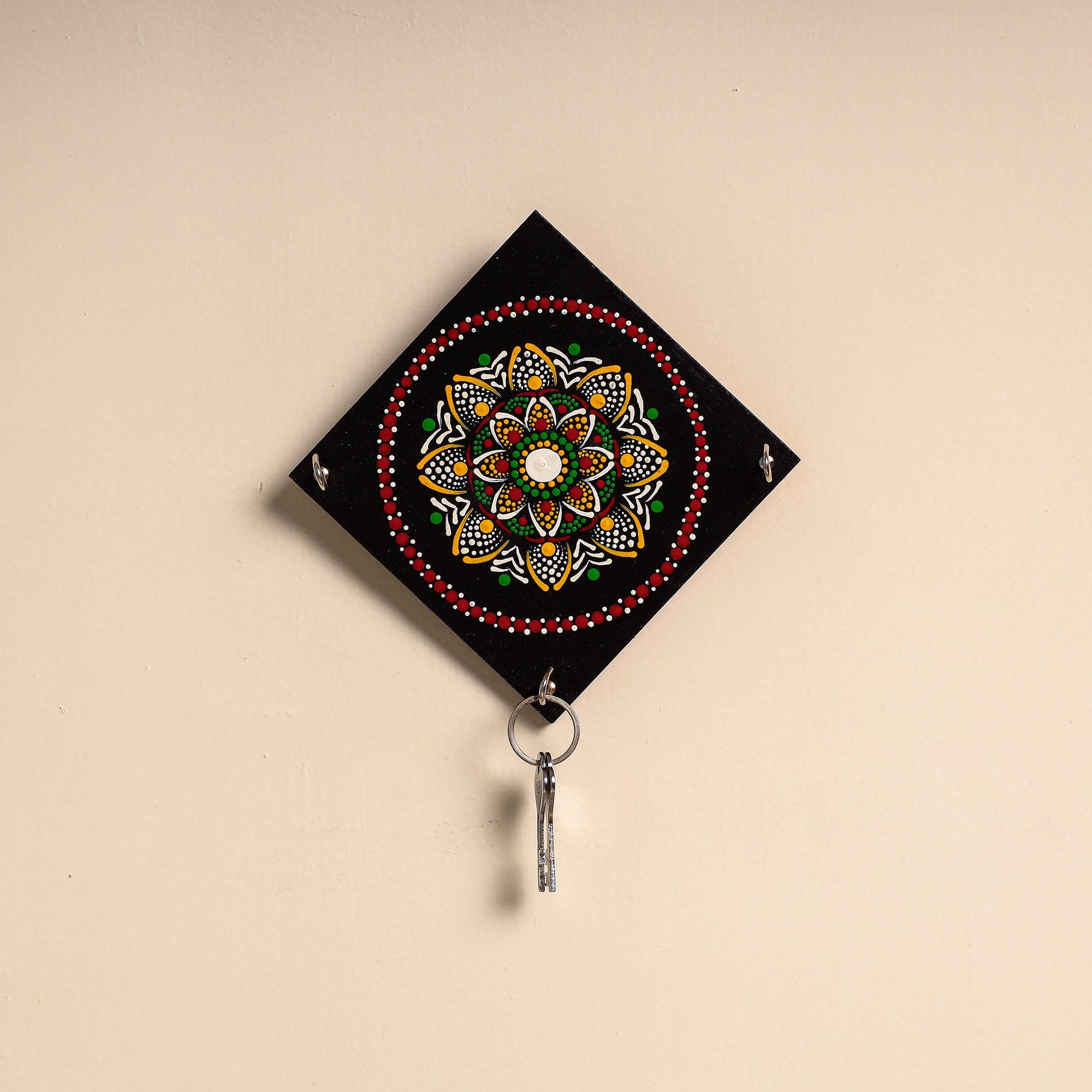 Handmade dot Mandala art keyholder is hand-painted on MDF wood with waterproof paints. Mandala is a geometric symbol configuration. Mandala 1st appeared in the 4th century in India, inside Buddhist monasteries. Buddhist monks created mandala because of the meditative process that helped their minds become more enlightened. A mandala generally represents the spiritual journey, strating from the outside to the inner core through the layers. Mandala have been used as art therapy. It is also known as the "art of relaxation. Mandala art is both therapeutic and symbolic.