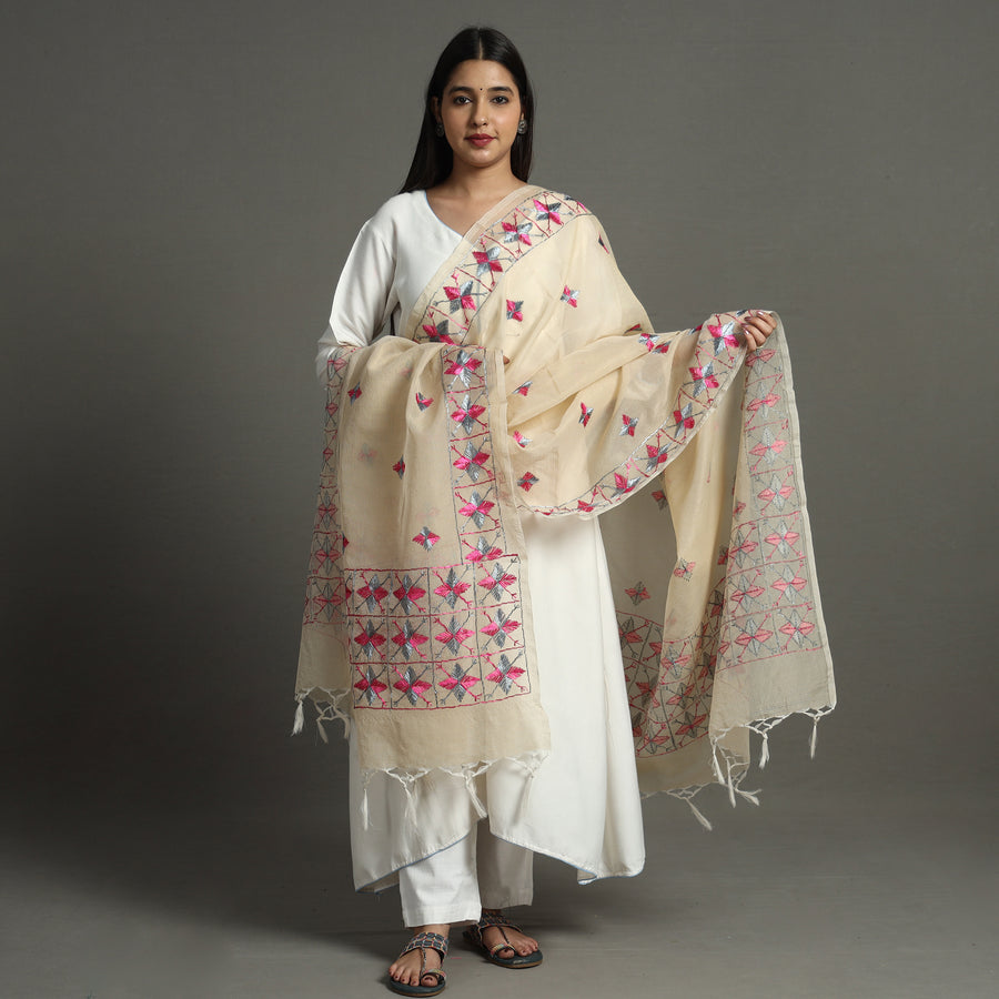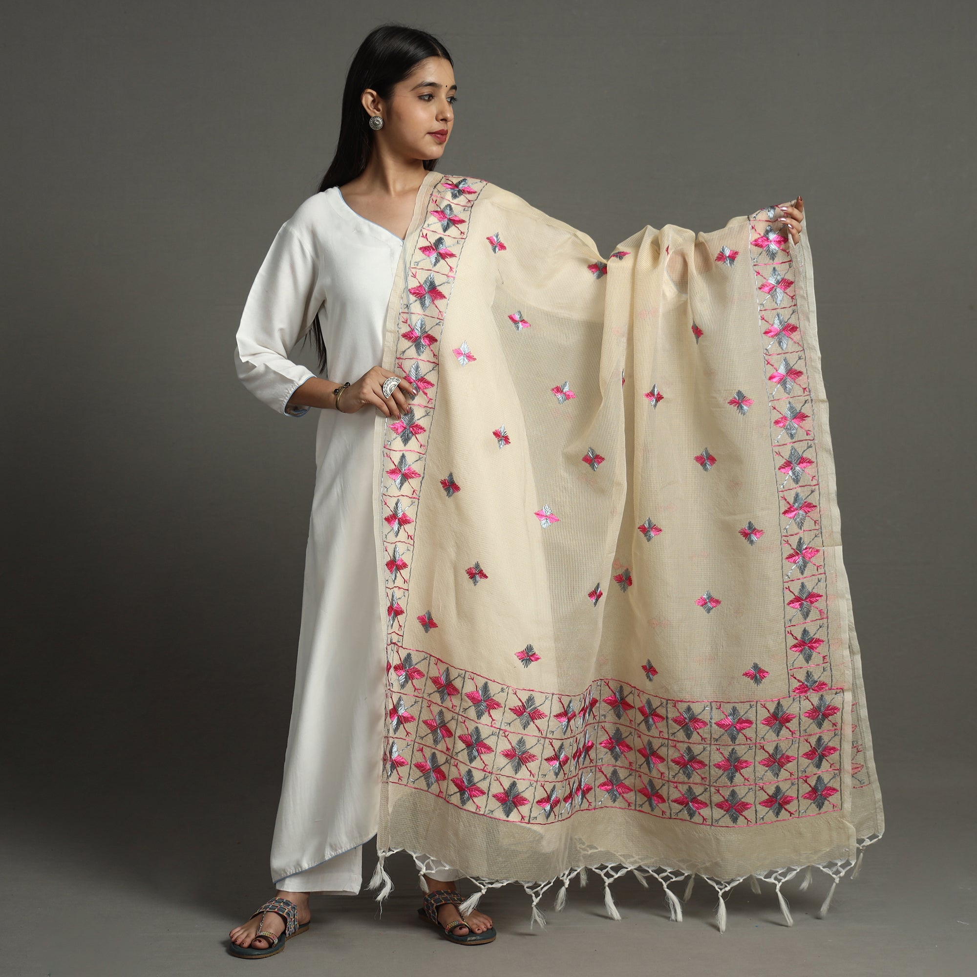 Fine quality beige phulkari hand embroidery kota doria chanderi silk dupatta with tassels. Phulkari is a very refined embroidery work of Punjab region. The word phul means flower and kari means craft, Phulkari is the art of making beautiful intricate designs and motifs on fabrics with different colored threads. A variation of Phulkari is Bagh work, literally meaning garden, a variation where the embroidery completely covering the material entirely, it is called bagh (a garden of flowers). Hand-embroidered by skilled crafts people of Punjab. Kota doria is an age-old Indian textile produced in the Kota district of Rajasthan. The Doria or the threads are finely interweaves to make the check patterns. Its lightweight and sheer texture giving an exquisite grace and elegance of its own.