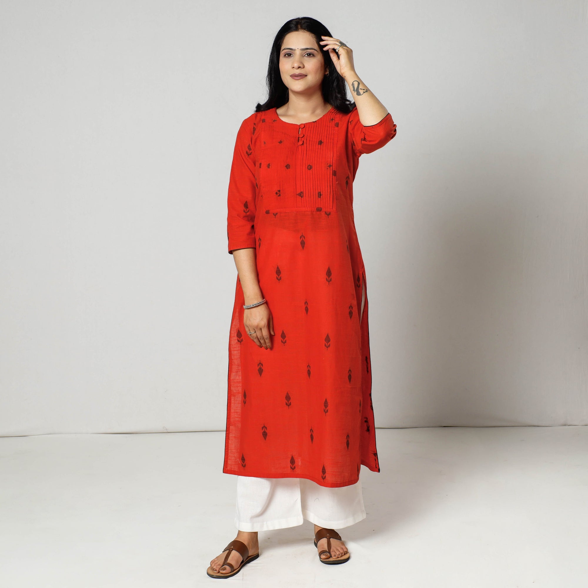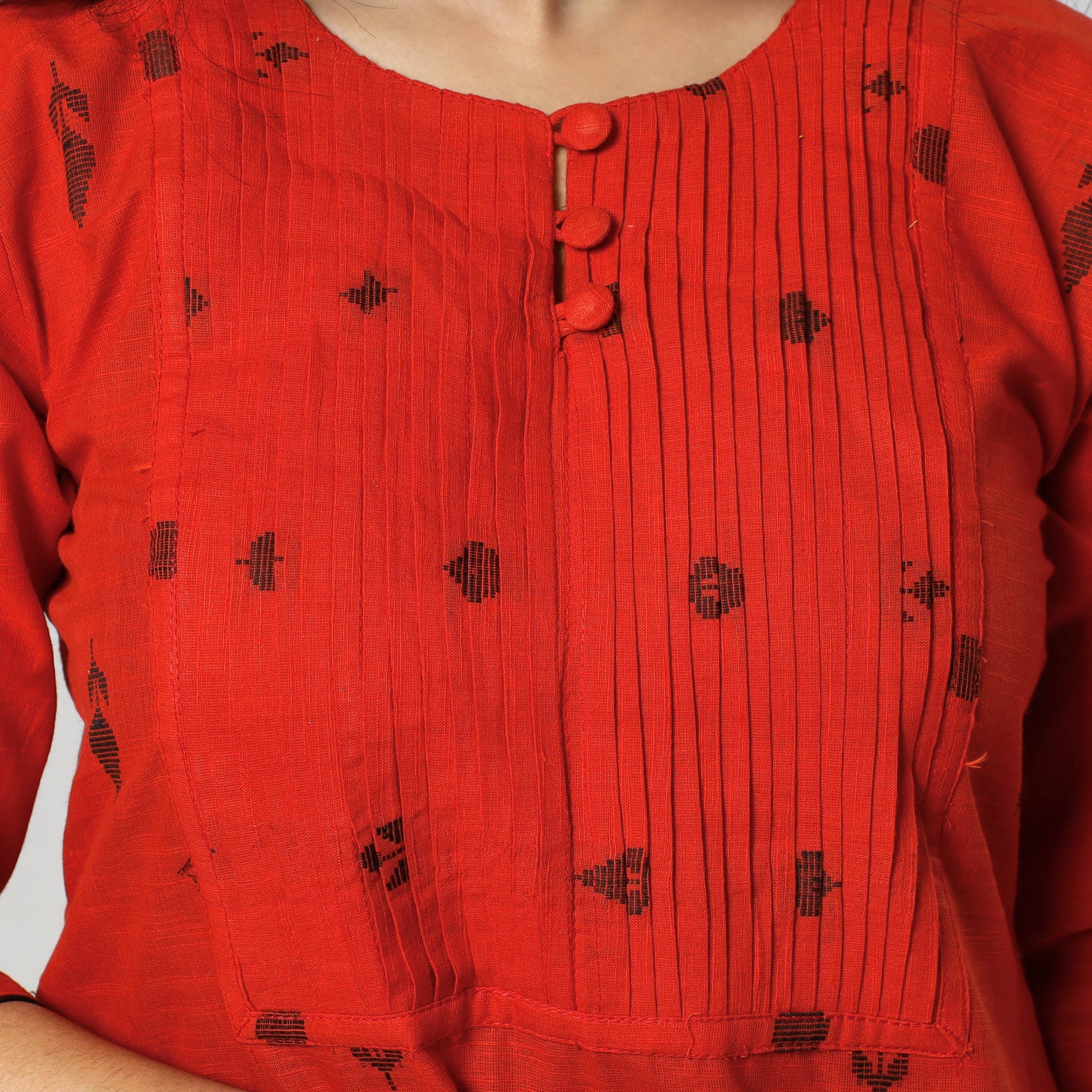 Look and feel beautiful in this uniquely designed jacquard cotton pintuck long kurti with one side pocket. This cotton kurti makes you comfortable with ease all day long.