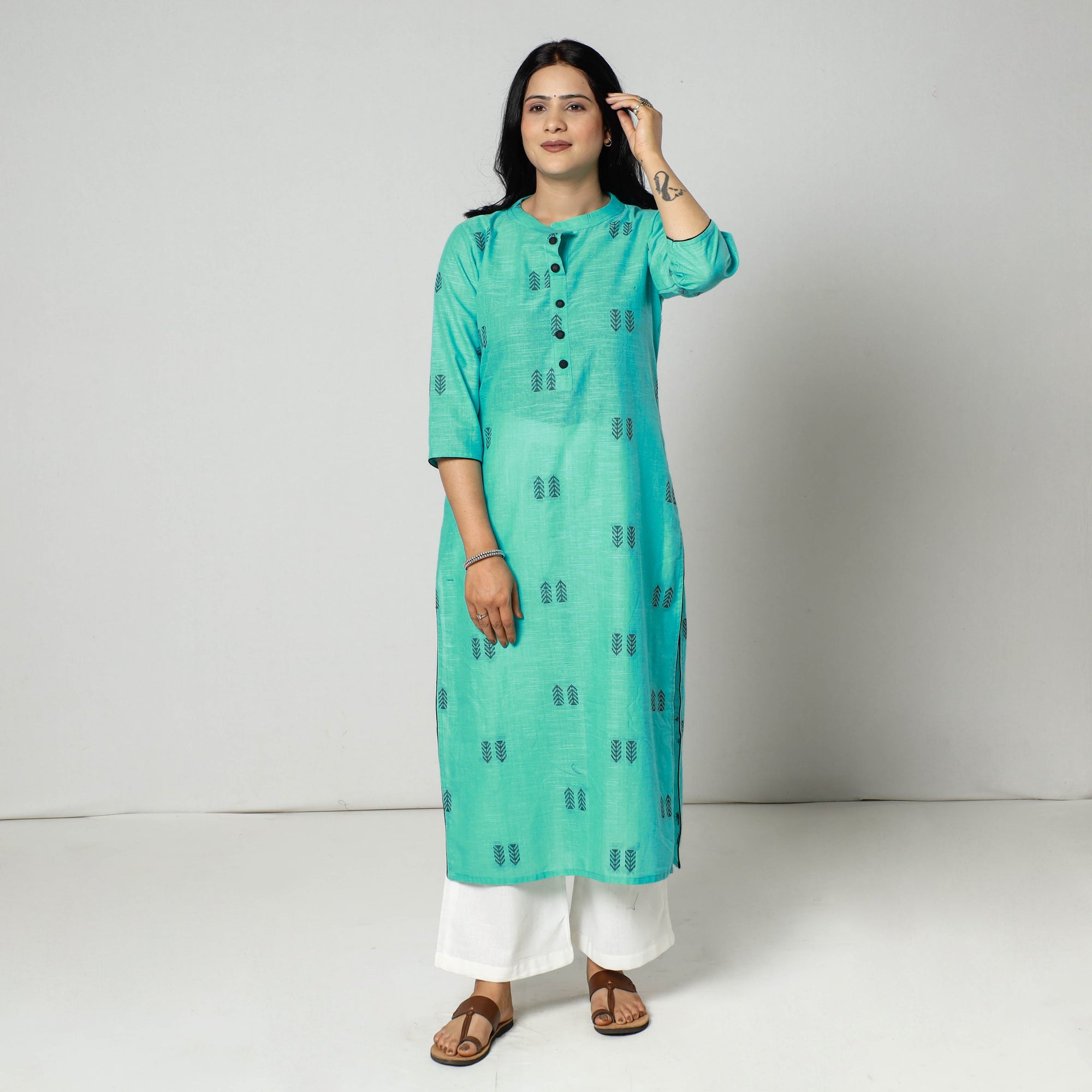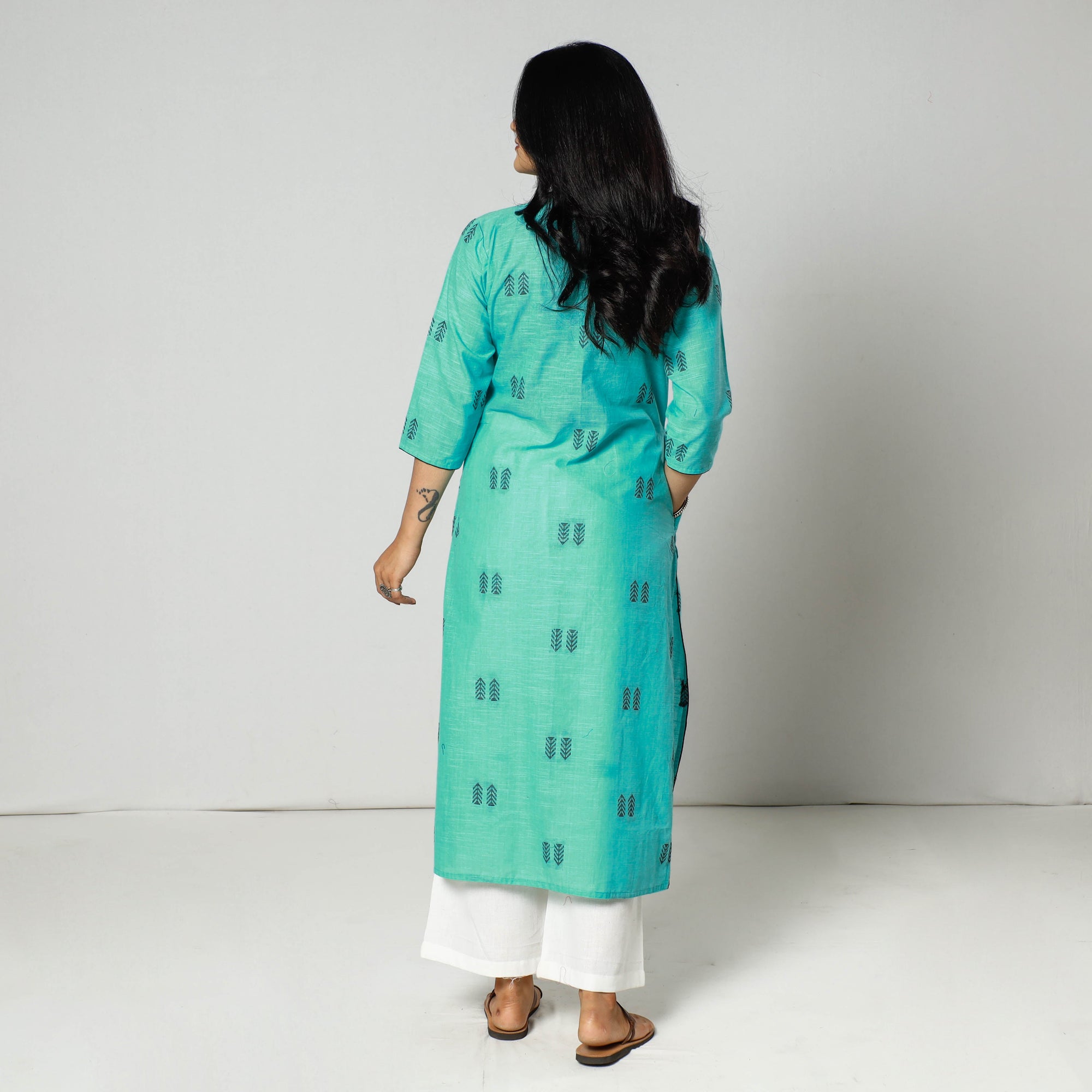 Look and feel beautiful in this uniquely designed mint green jacquard cotton long Kurta with one side pocket. This cotton Kurta makes you comfortable with ease all day long.