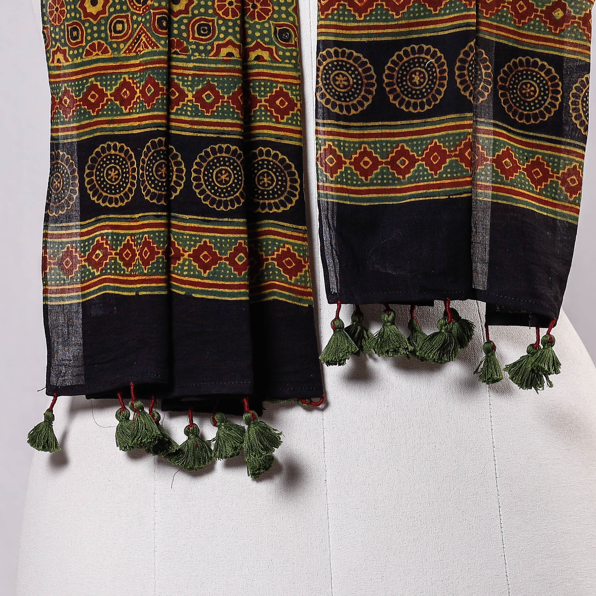 Fine quality green ajrakh block printing mul cotton stole with tassels, made using natural dyes through traditional technique of hand block printing by Sufiyan Khatri practised in Kutch region of Gujarat.