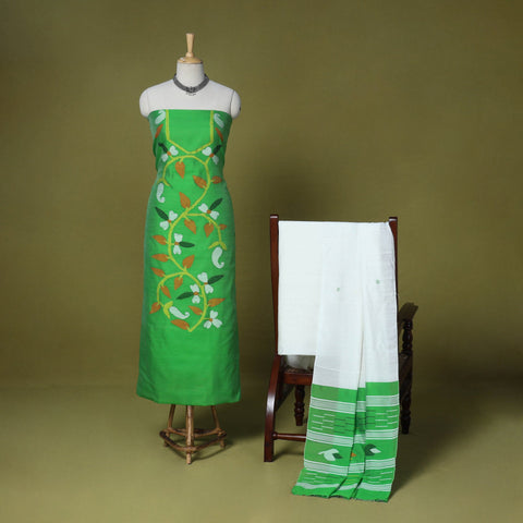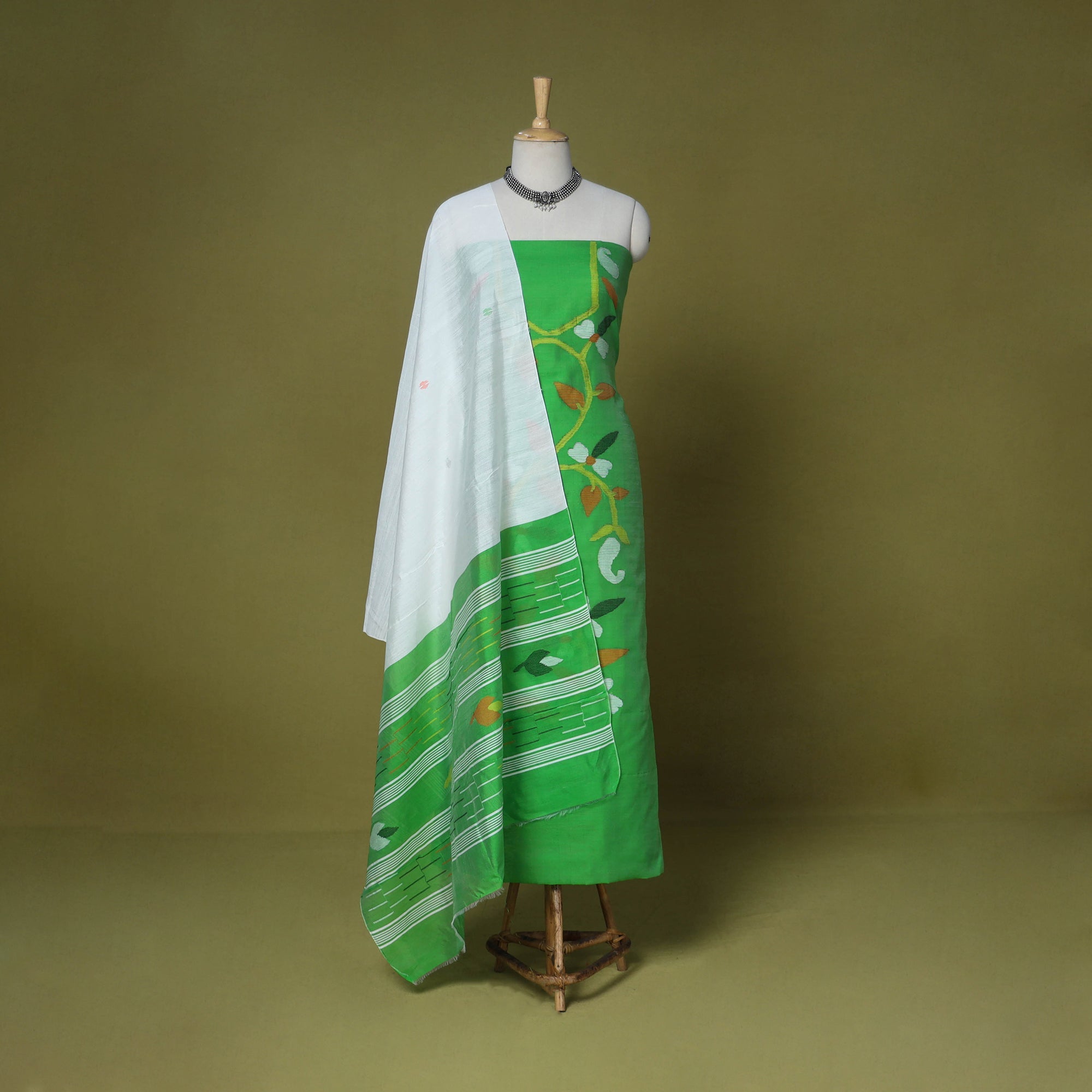 Fine quality green phulia jamdani weave handloom silk-cotton 3pc suit material set. Jamdani (extra weft) weaving, a style unique to Bengal…literally like “hand embroidery” on the loom. The method of weaving resembles tapestry work in which small shuttles of coloured, gold or silver threads, are passed through the warp. Jamdani, because of its intricate patterns, has always been a highly expensive product. The process is extremely time consuming as it involves a tedious form of hand looming.