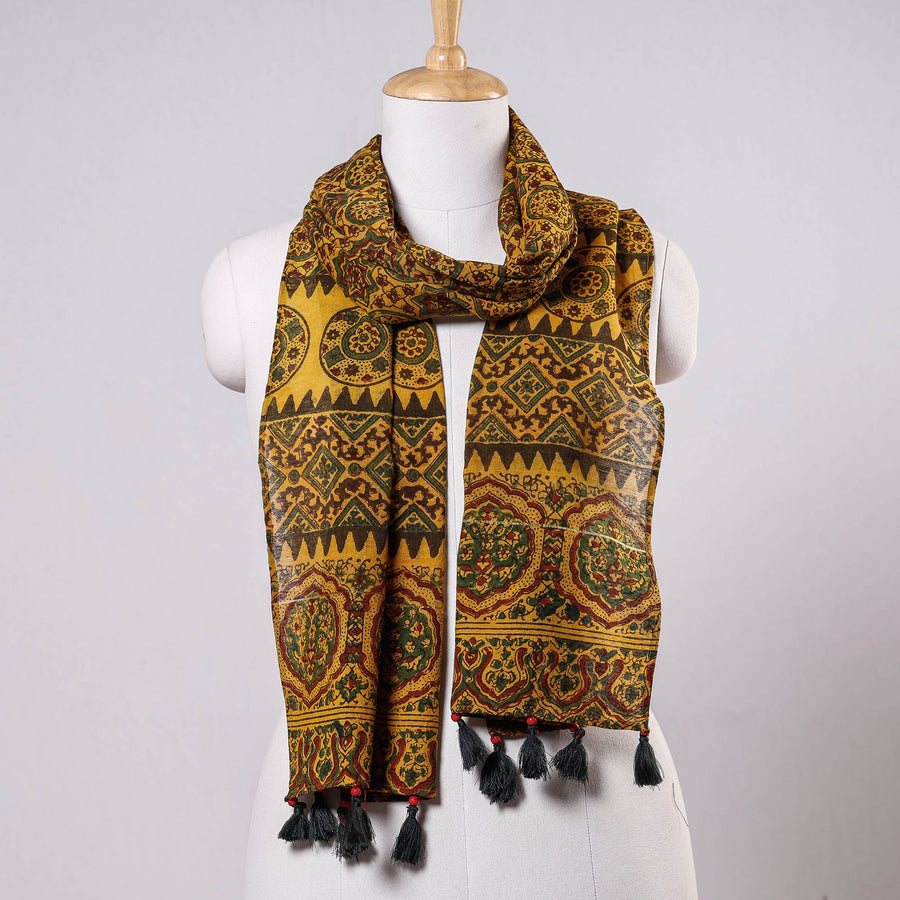 Fine quality yellow ajrakh block printing chanderi silk-cotton zari border stole with tassels made using natural dyes through traditional ajrakh technique of hand block printing. Chanderi silks are known for their gossamer looks and amazing feel.