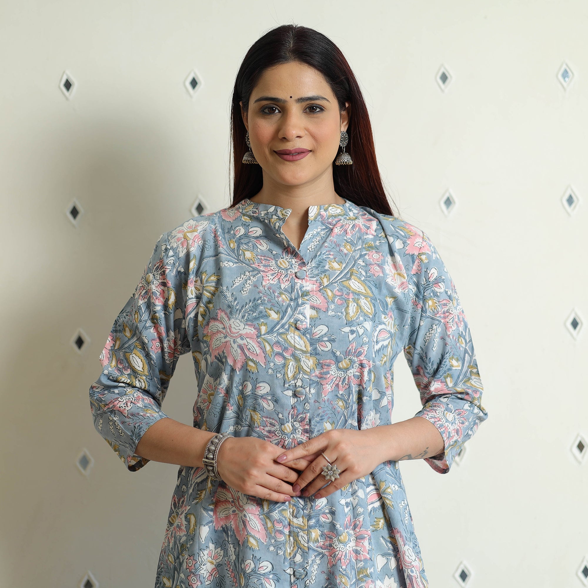 Look and feel beautiful in this uniquely designed sanganeri block printed cotton long kurta with one side pocket. This cotton kurta makes you comfortable with ease all day long. Sanganeri is a hand-block printing technique originating from Sanganer, a village in the southern part of Jaipur, Rajasthan. Bleed free VAT dyes used.