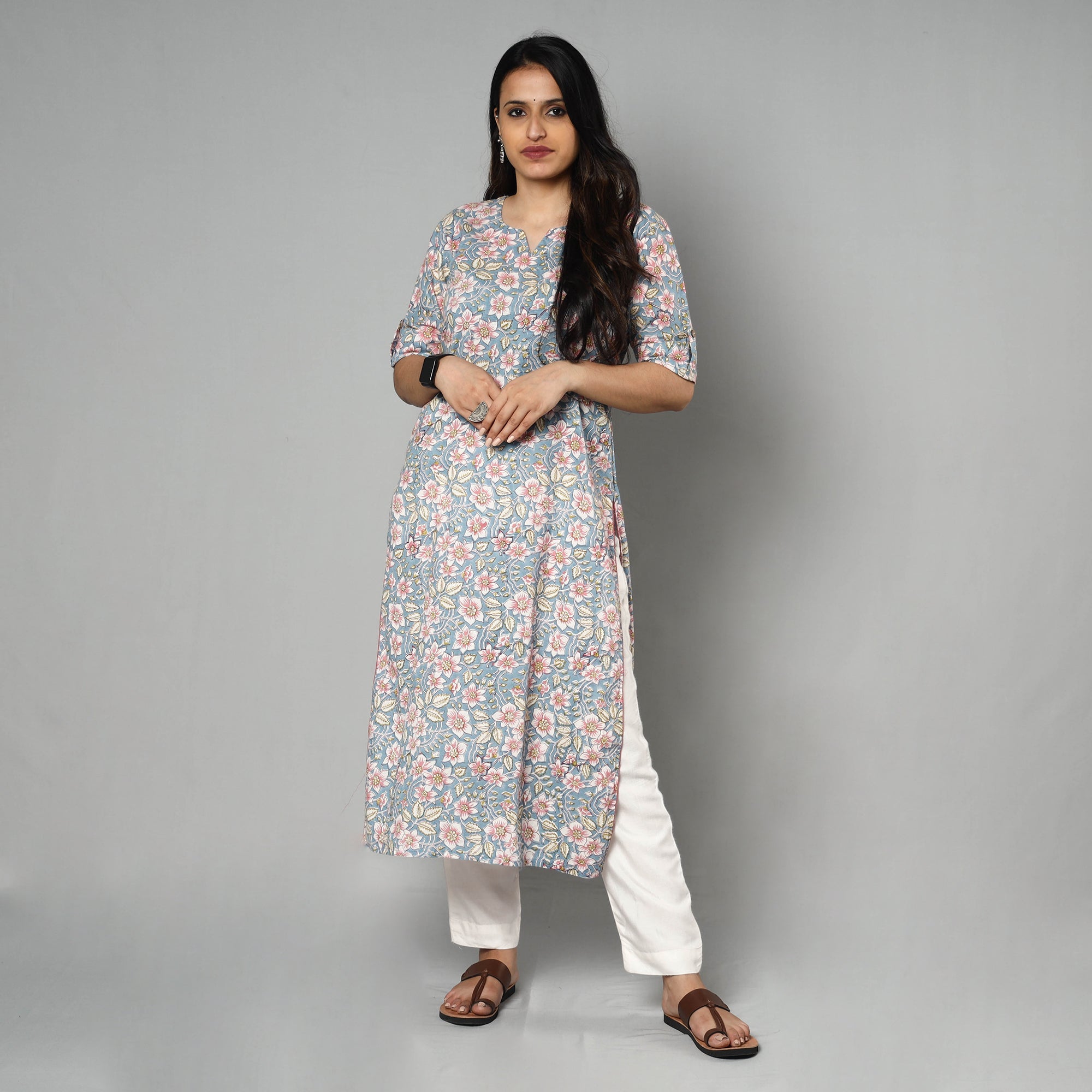 Look and feel beautiful in this uniquely designed sanganeri block printed cotton long straight kurta with one side pocket. This cotton kurta makes you comfortable with ease all day long. Sanganeri is a hand-block printing technique originating from Sanganer, a village in the southern part of Jaipur, Rajasthan. Bleed free VAT dyes used.