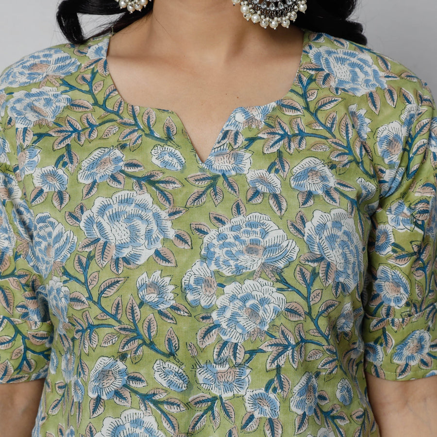 Look and feel beautiful in this uniquely designed sanganeri block printed cotton long kurti with one side pocket. This cotton kurti makes you comfortable with ease all day long. Sanganeri is a hand-block printing technique originating from Sanganer, a village in the southern part of Jaipur, Rajasthan. Bleed free VAT dyes used.