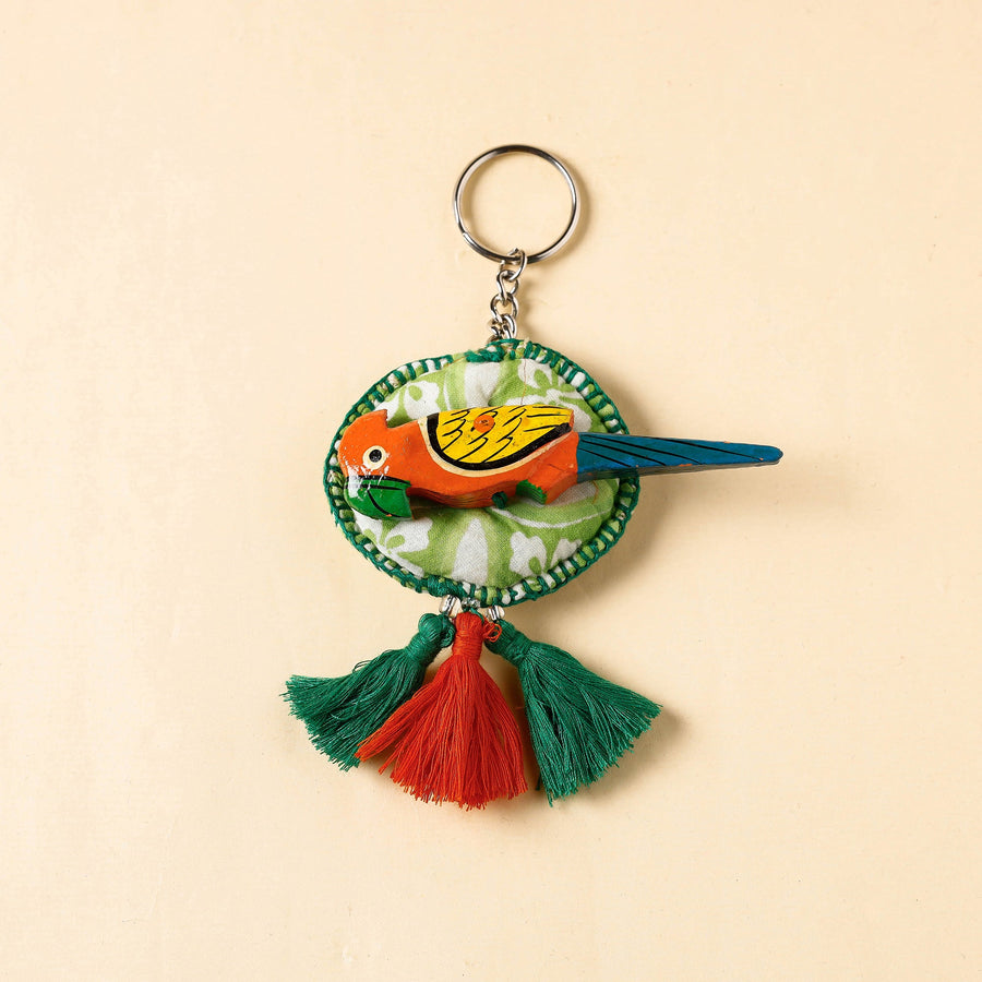Handcrafted green fab artwork keychain with a wooden animal motif and tassels. This beautiful keychain is made of cotton fabric with kapok stuffing inside, and a wooden animal is attached to it.