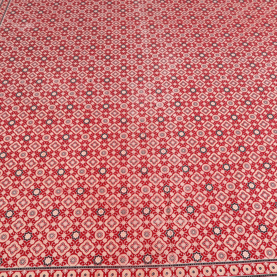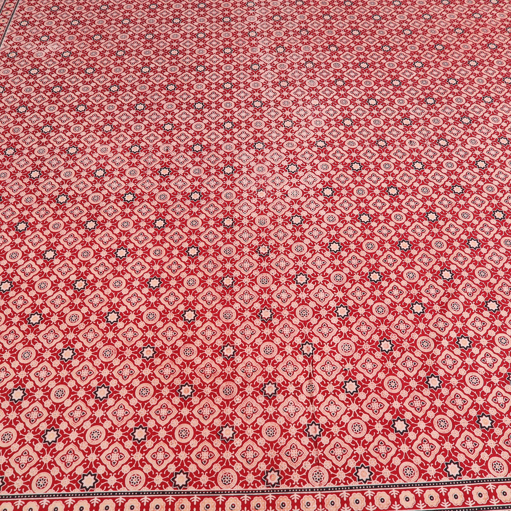 Fine quality ajrakh block printing cotton double bed cover with pillow covers, made using natural dyes through traditional process of hand block printing practised by the master artisans in Kutch region of Gujarat. Ajrakh is a traditional vegetable dyeing and resist block-printing technique on cloth. It is estimated to be around 4,500 years old. The Ajrakh artisans in India are originally from Sindh, and they migrated to Kutch in Gujarat and Barmer in Rajasthan. Ajrakh is the traditional attire of the Maldhari pastoral community of Bhuj. The process of "Ajrakh" is a long, drawn-out process with many stages, and each layer of colour is printed after a gap of time, so the cloth has to stay for the day.