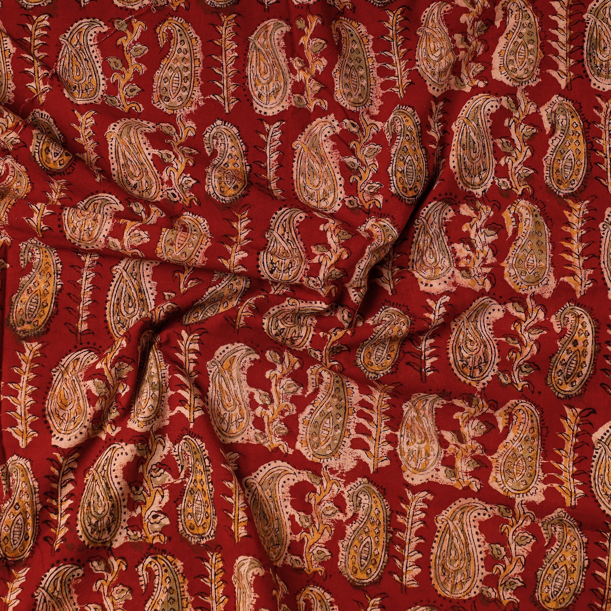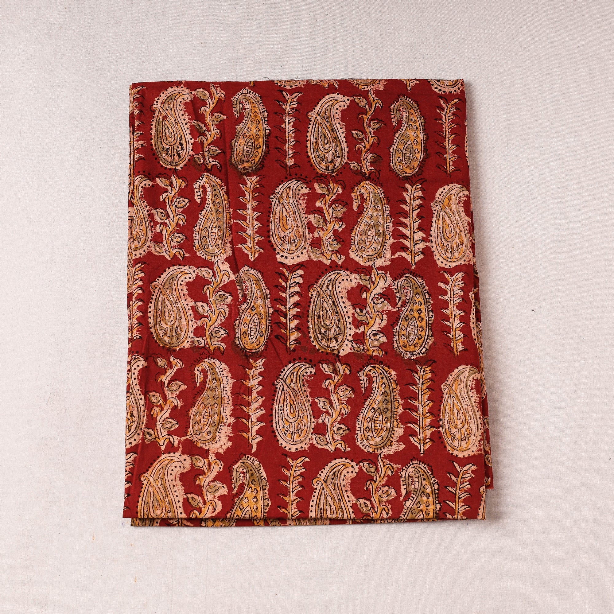 Fine quality red kalamkari block printing cotton precut fabric made using natural dyes through traditional process of hand block printing practised by the artisans of Andhra Pradesh. Kalamkari is the earliest and more complex techniques of block-printing. Showcasing an assortment of hand block printed motifs inspired by traditional kalamkari painting.