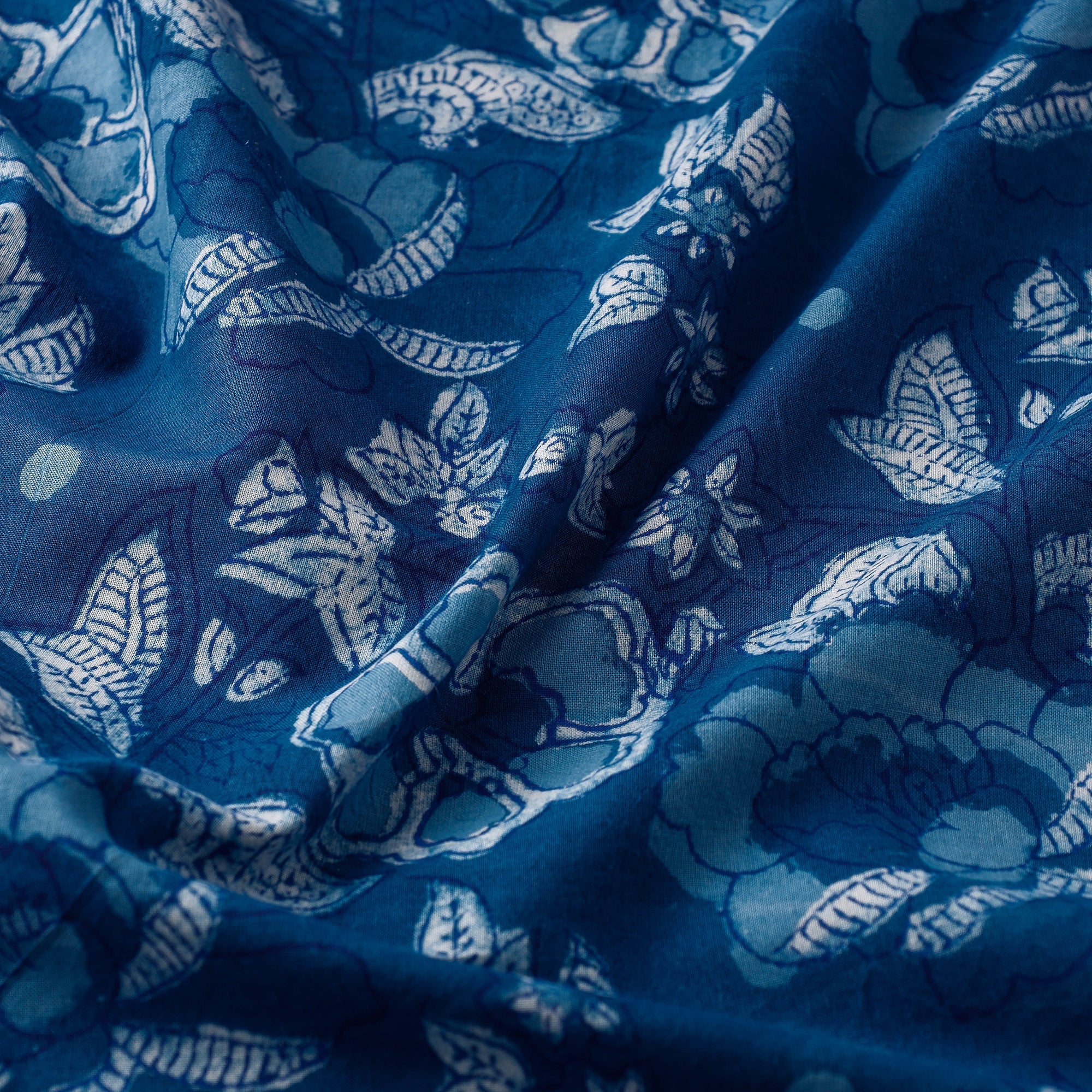 Fine quality indigo dabu hand block printing pure cotton fabric, made using natural dyes through traditional mud resist process by using hand carved wooden block practiced in Bagru, Rajasthan.