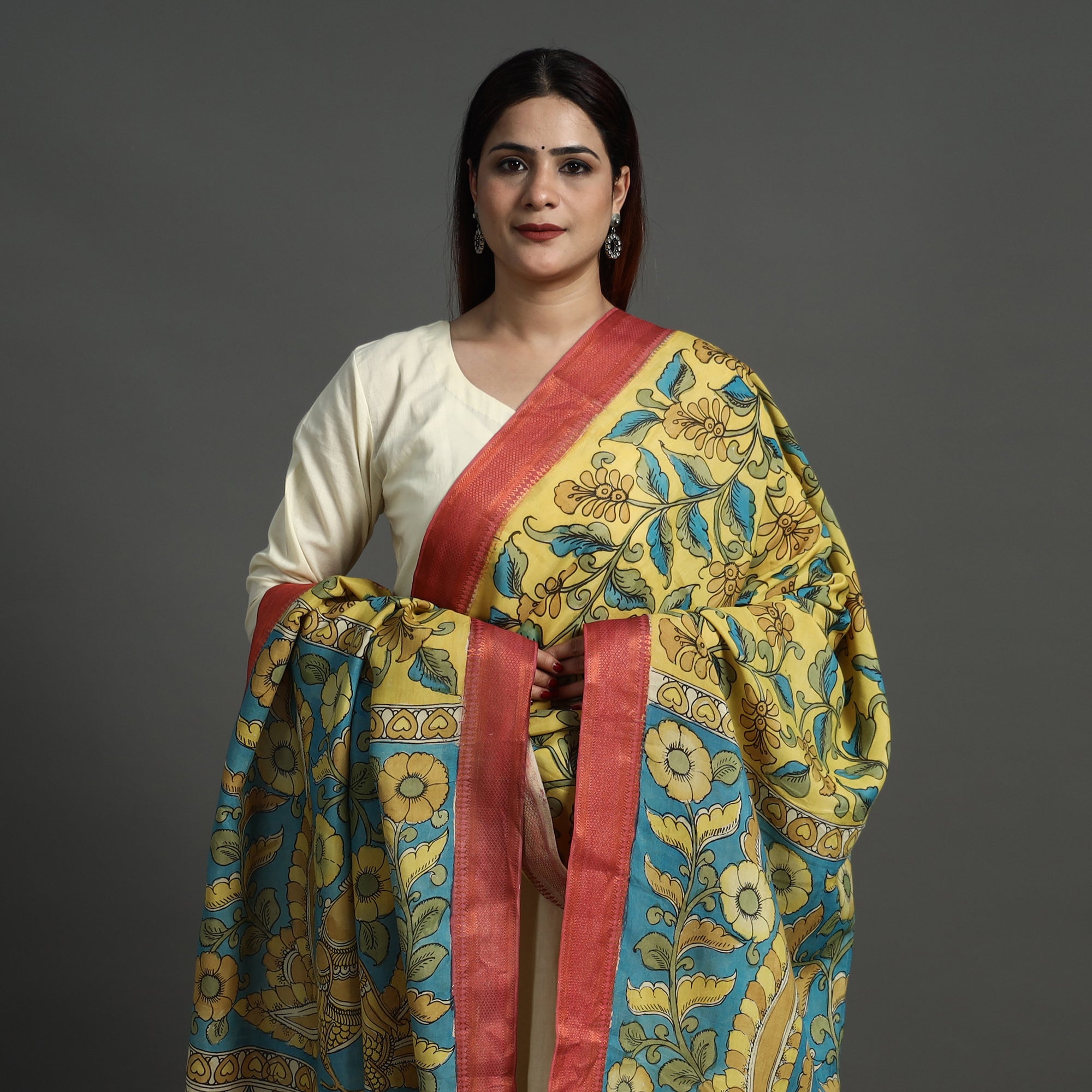 Fine quality yellow srikalahasti pen work handpainted kalamkari chanderi silk-cotton zari border dupatta with tassels. This exquisite dupatta is created with Srikalahasti style of kalamkari, wherein the "kalam" or pen is used for free hand drawing of the subject and filling in the colours. It is entirely hand worked using natural colours. Kalamkari in Srikalahasti has been around for 200 years approximately. Unlike other places where this particular craft is practiced, artists in Srikalahasti retains the ancient techniques of dyeing which have been passed down from generations. As it is hand-painted/handcrafted, colour spread and irregularity in design is common, hence it won't be considered as damaged or defective.
