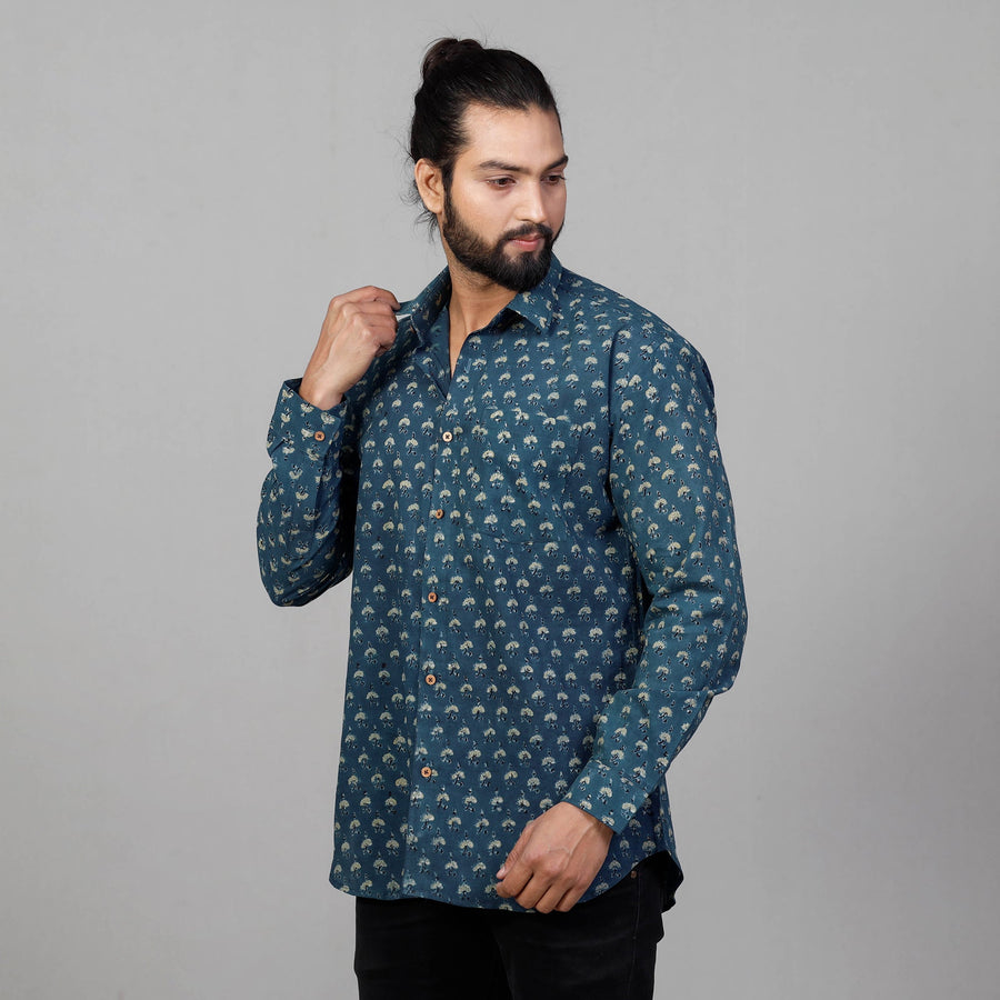 Fine quality ajrakh block printing cotton men full sleeve shirt. This shirt is made using natural dyes through the traditional ajrakh technique of hand block printing practised in the Kutch region of Gujarat. This shirt features a regular collar, full sleeves, crisp wooden buttons, and a patch pocket on the front. It is the perfect addition to your casual wardrobe.