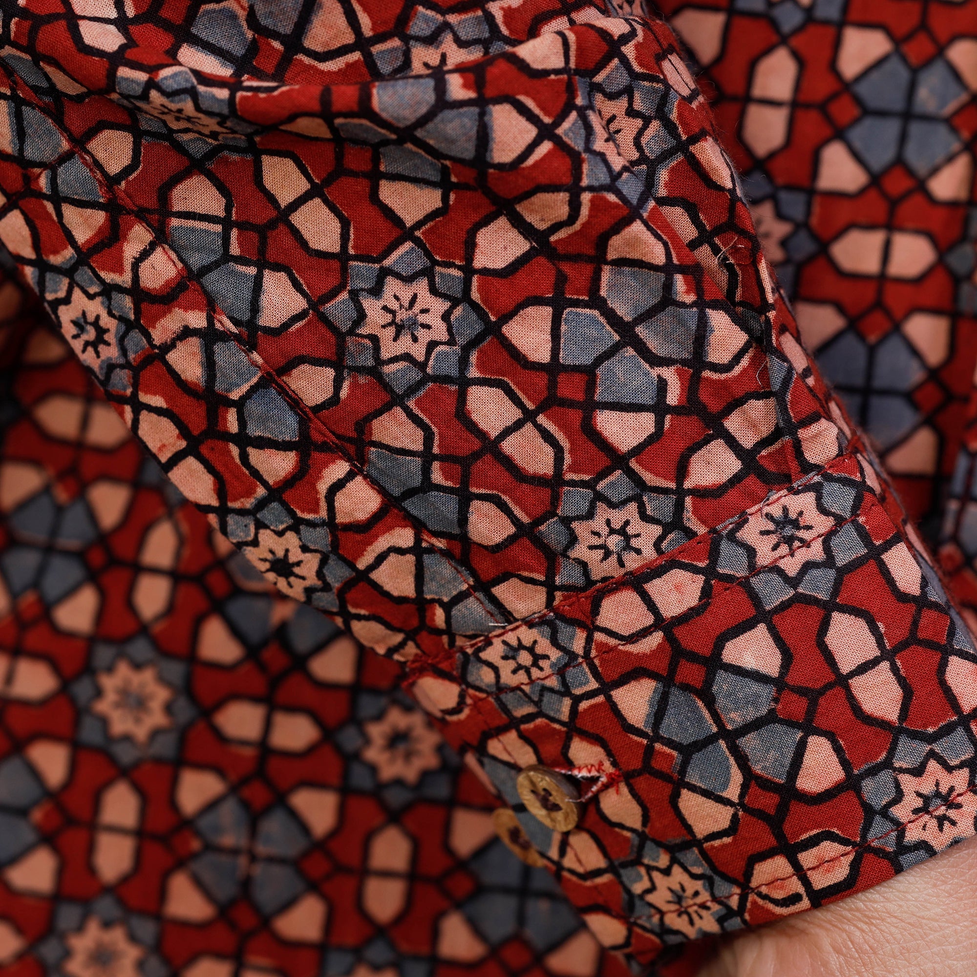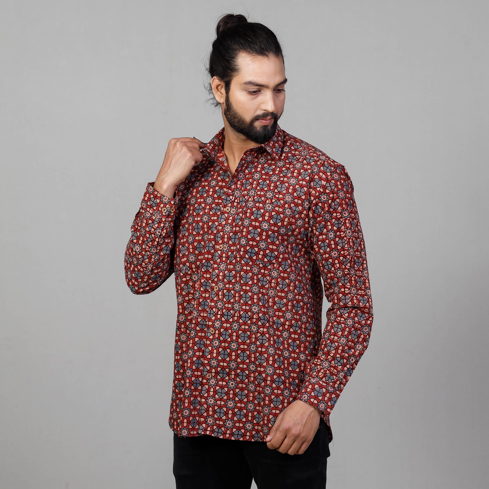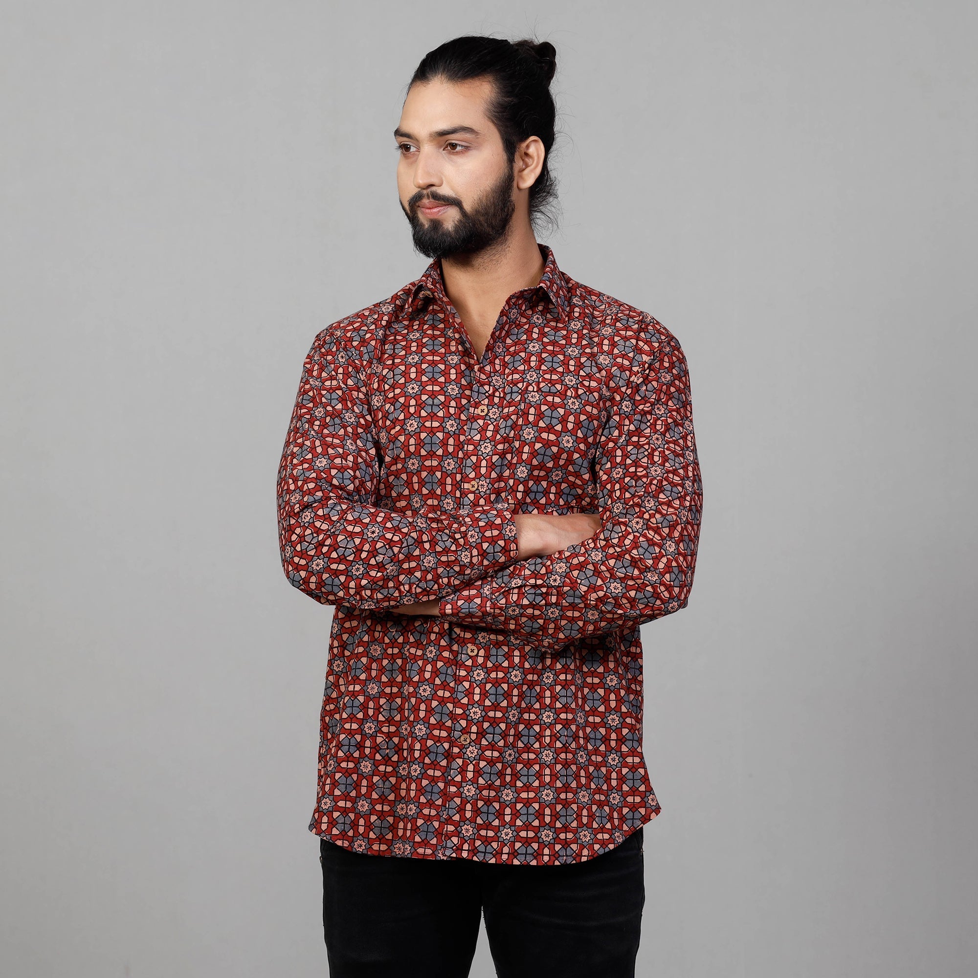 Fine quality ajrakh block printed cotton men full sleeve shirt. This shirt is made using natural dyes through the traditional ajrakh technique of hand block printed practised in the Kutch region of Gujarat. This shirt features a regular collar, full sleeves, crisp wooden buttons, and a patch pocket on the front. It is the perfect addition to your casual wardrobe.