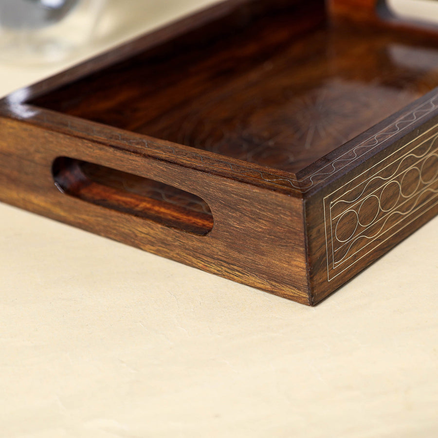 Tarkashi metal inlay work brown tray made of rosewood, handcarved by the artisans of Jaipur, Rajasthan.