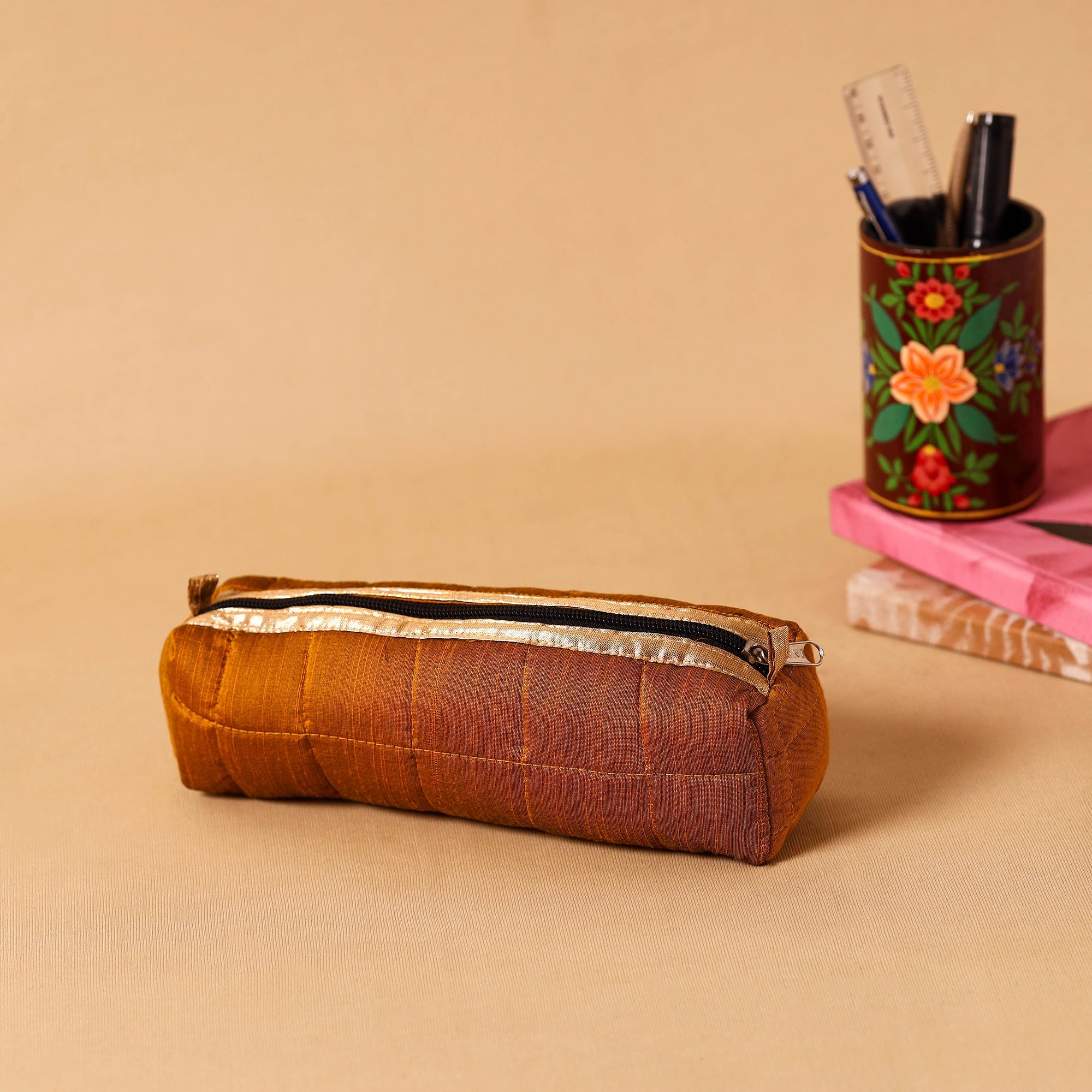 A handcrafted orange quilted pencil pouch made from banarasi zari buti silk fabric with gota work, can be used for a variety of purposes, including small cosmetics, make-up, school stationery, travel, medicine, jewelry kit pouches, and coin purses.