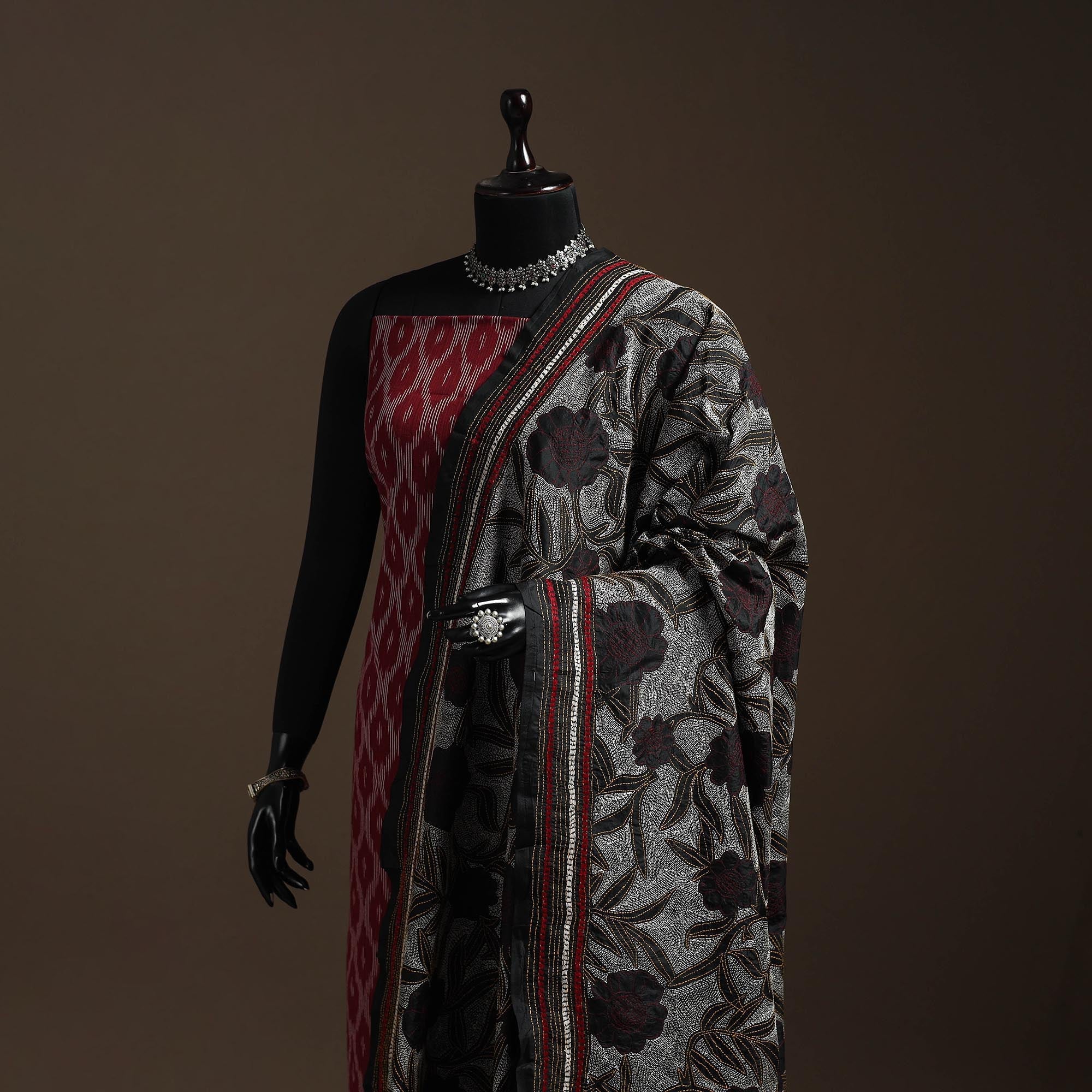 Fine black handwoven pure tussar silk dupatta hand embroidery with original nakshi kantha work done by master artisan Takdira Begum from Bolpur, West Bengal.