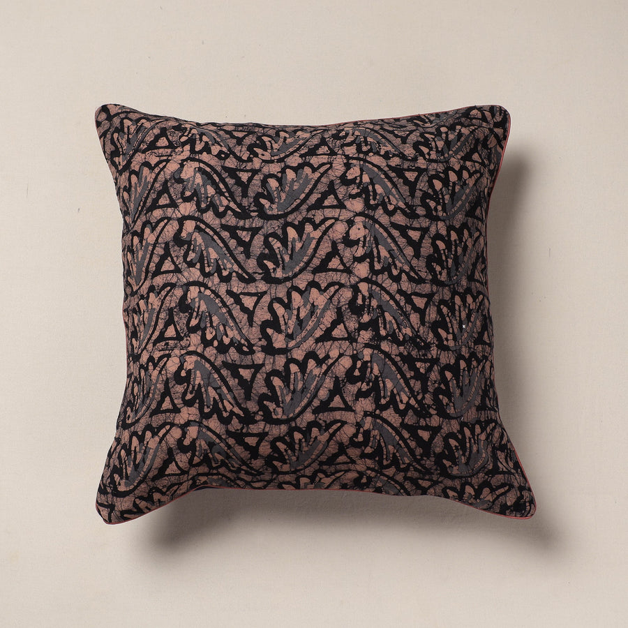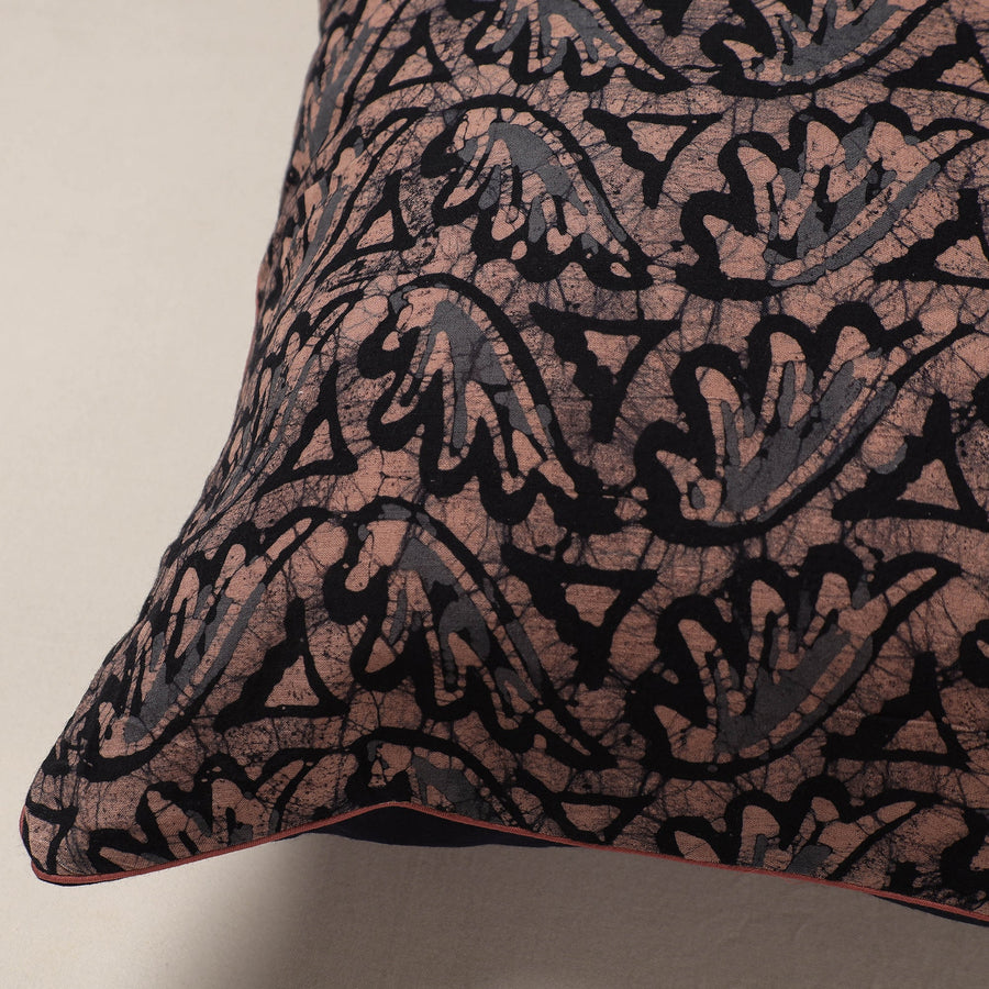 Fine quality brown hand batik printing cotton cushion cover. Batik is a technique of wax-resist dyeing applied to whole cloth, or cloth made using this technique. The traditional designs and motifs in Indian batik are often passed down from one generation to another.