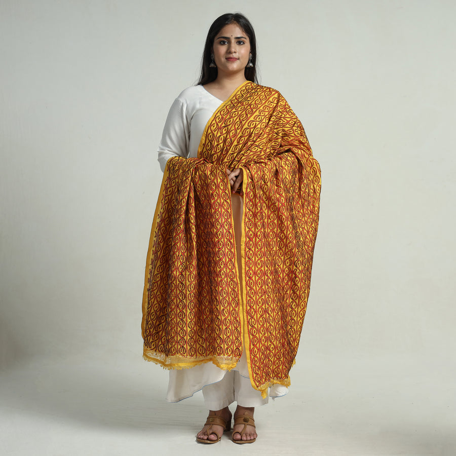 Fine quality original bengal kantha embroidery block printing silk handloom dupatta, designed with contemporary patterns & has been hand embroidered using West Bengal's traditional craft technique of Kantha.