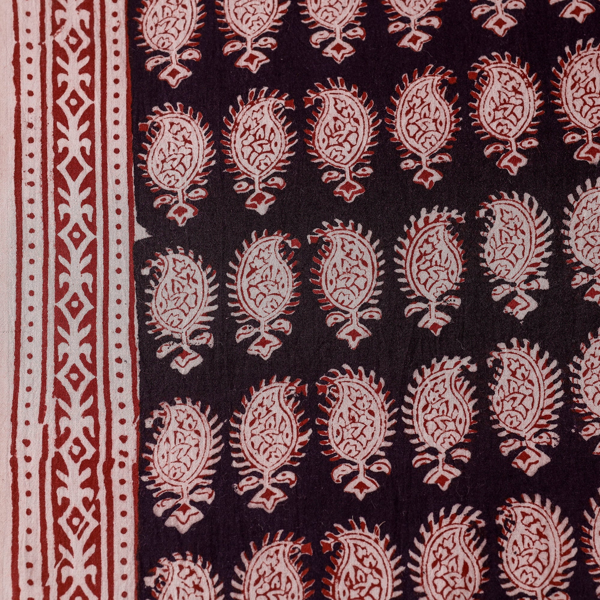 Fine quality black bagh block printing cotton fabric, made using natural dyes through traditional process of hand block printing by Umar Faruk Khatri practiced in Bagh, the Dhar district of Madhya Pradesh.
