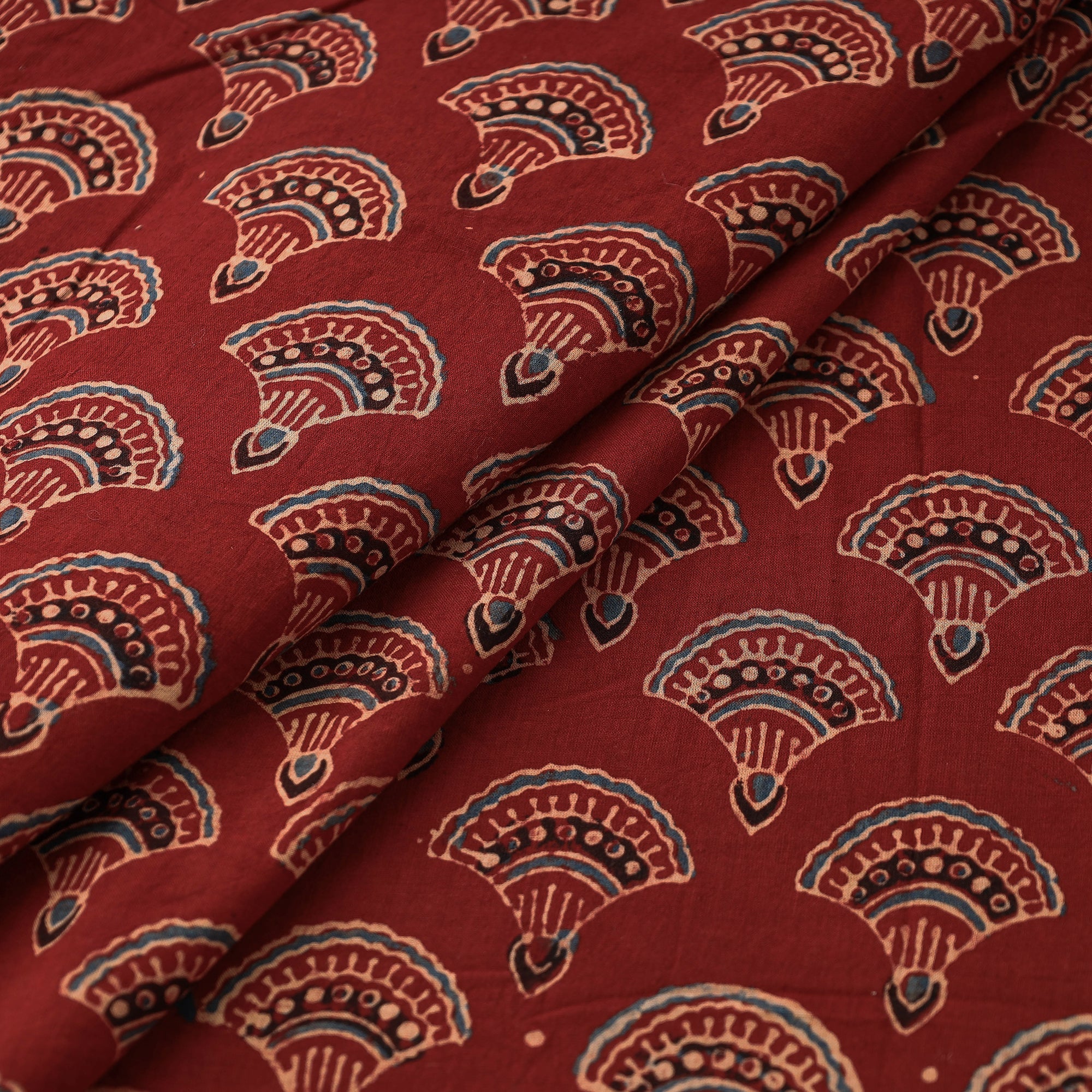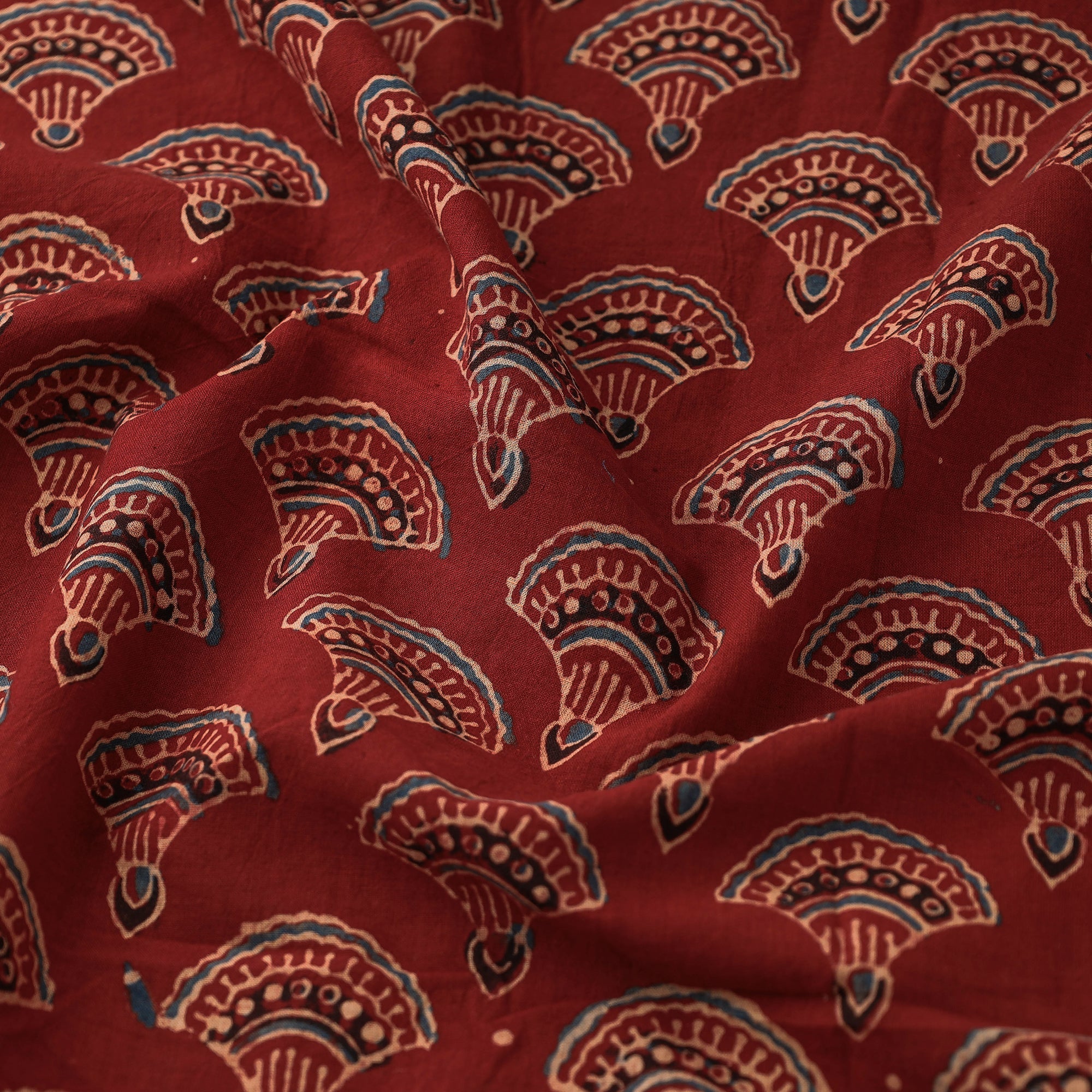 Fine quality maroon ajrakh block Printed cotton fabric, made using natural dyes through traditional ajrakh technique of hand-block printing practised by the artisans in Kutch region of Gujarat. Ajrakh is a traditional vegetable dyeing and resist block-printing technique on cloth. It is estimated to be around 4,500 years old. The Ajrakh artisans in India are originally from Sindh and they migrated to Kutch in Gujarat and Barmer in Rajasthan. Ajrakh is the traditional attire of the Maldhari pastoral community of Bhuj. The process of 'Ajrakh' is a long drawn process with many stages and each layer of colour is printed after a gap of time so the cloth has to stay for the day.