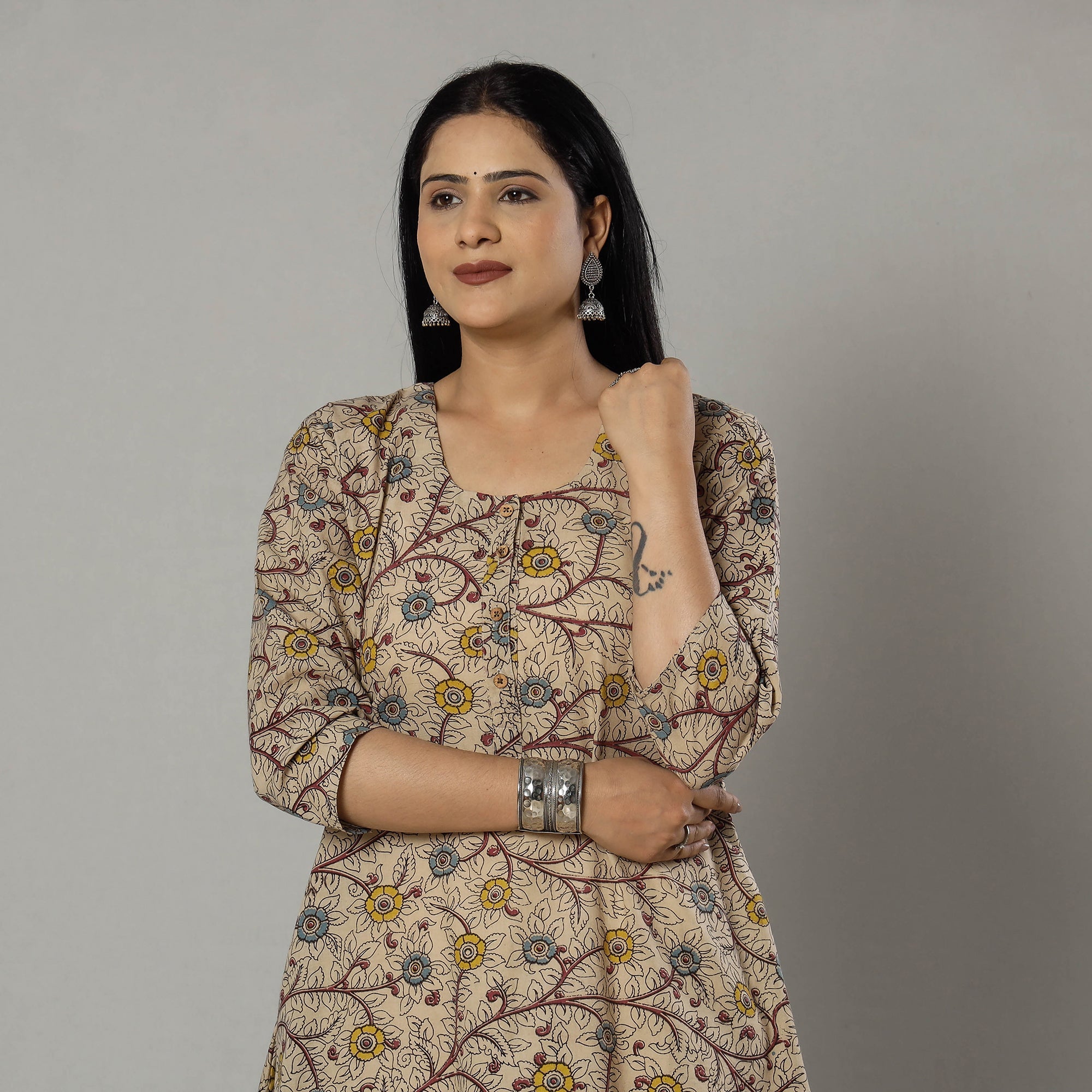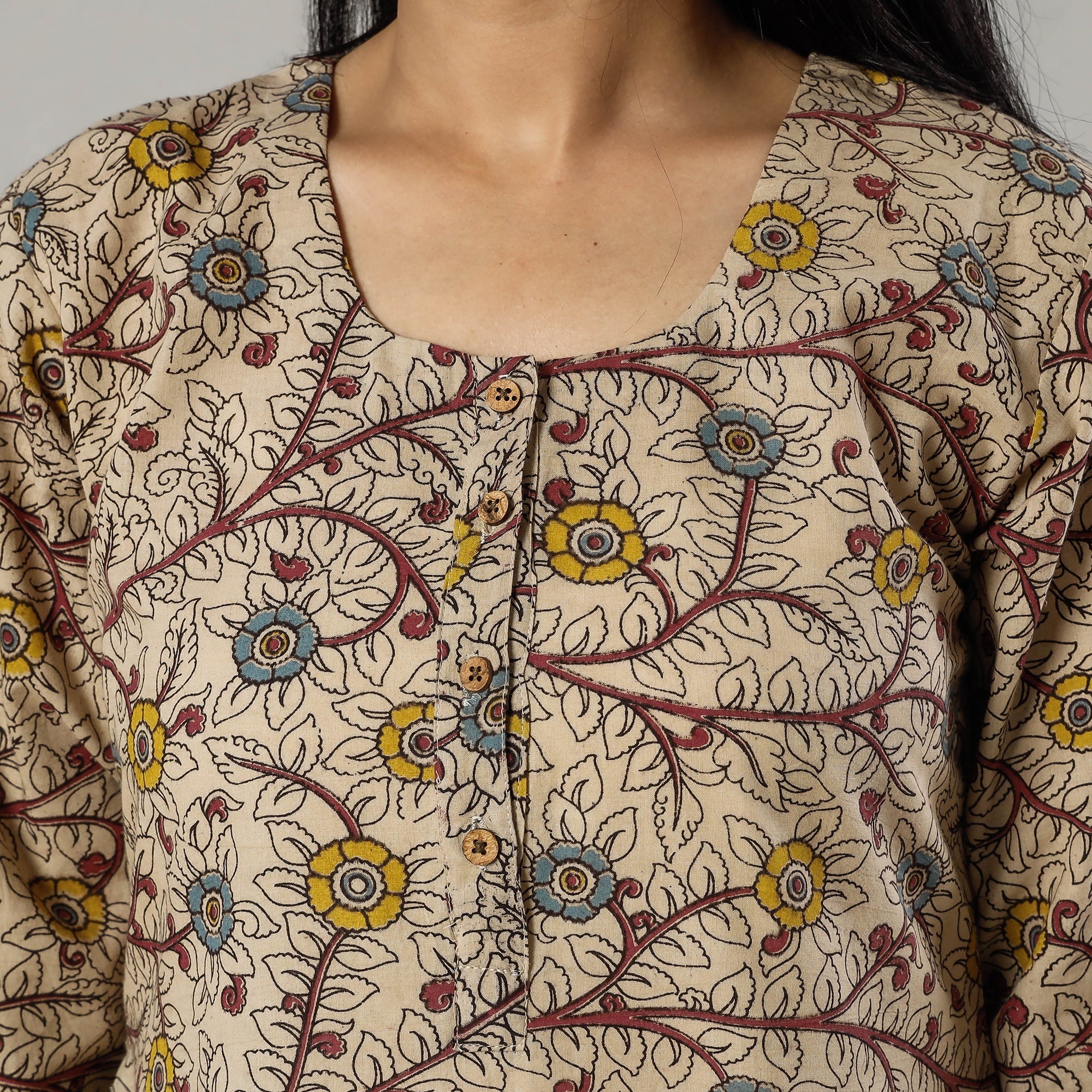 Look and feel beautiful in this uniquely designed cotton printed long kalamkari kurta with a side pocket. Kalamkari is the earliest and most complex technique of printing. This kurta is perfect for your daily outing and for a special occasion.