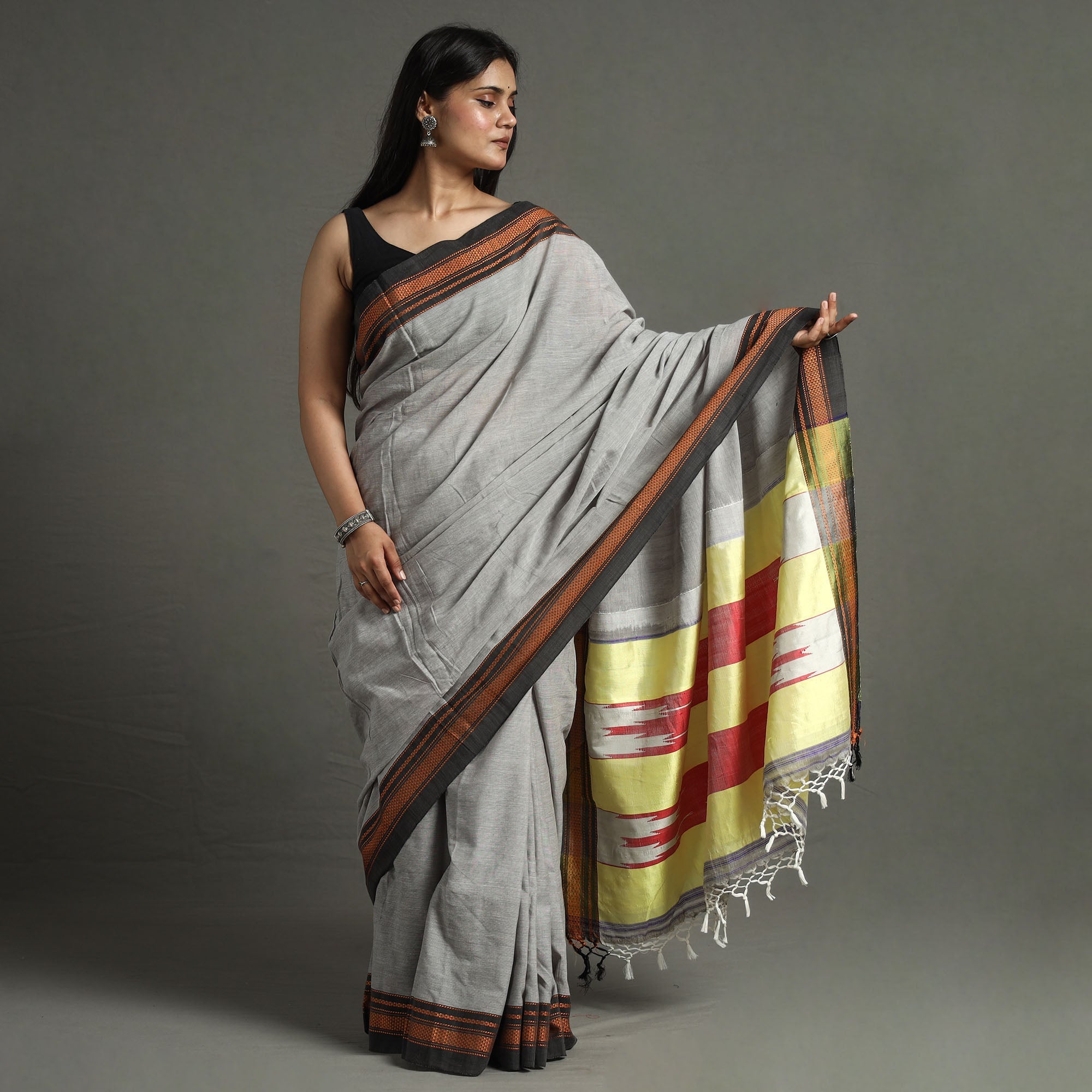 Fine quality ilkal handloom cotton saree with chikki paras border made by the skilled weavers of Karnataka. The saree body is made from cotton and the pallu is made from viscose silk (viscose is a semi-synthetic type of rayon fabric made from wood pulp).