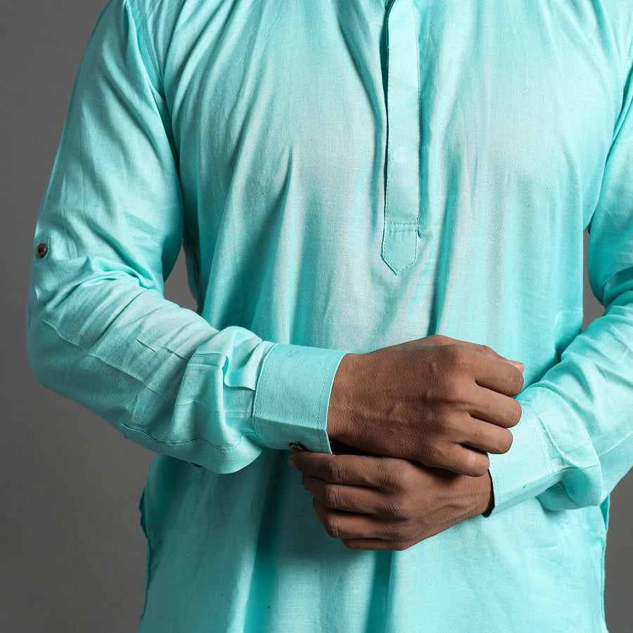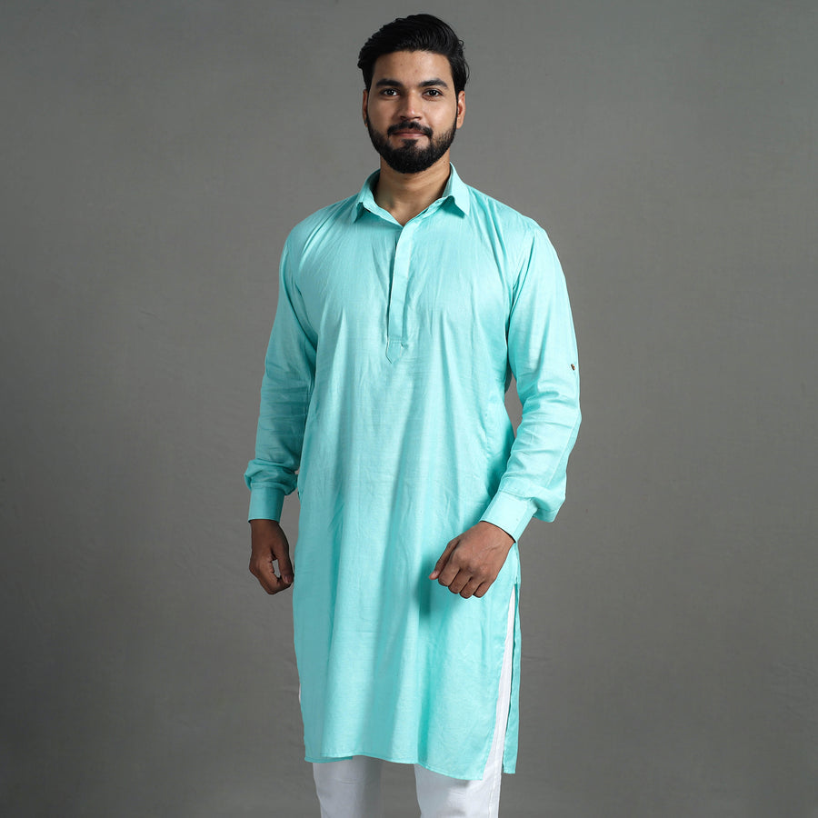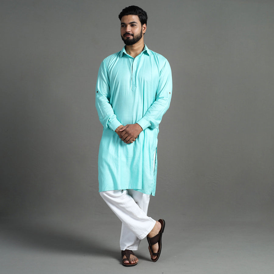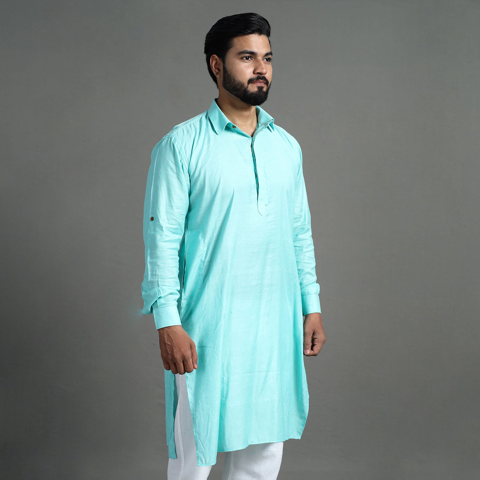 Fine quality plain viscose cotton blend men's long aqua blue pathani kurta with two side pockets makes you comfortable with ease all day long. It's made from linen fabric and features full sleeves and a regular collar with a button placket. This casual kurta is perfect for your daily outing and for a special occasion.