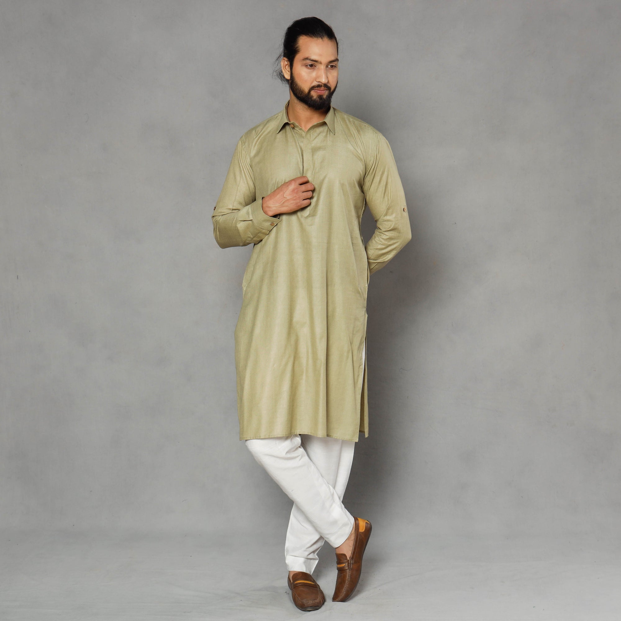 | Material | Fine quality moss green plain viscose cotton blend men's long pathani kurta with two side pockets makes you comfortable with ease all day long. It's made from linen fabric and features full sleeves and a regular collar with a button placket. This casual kurta is perfect for your daily outing and for a special occasion. |