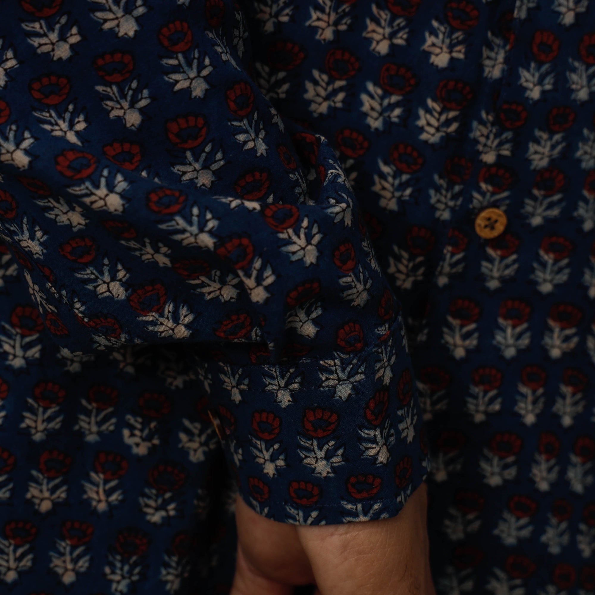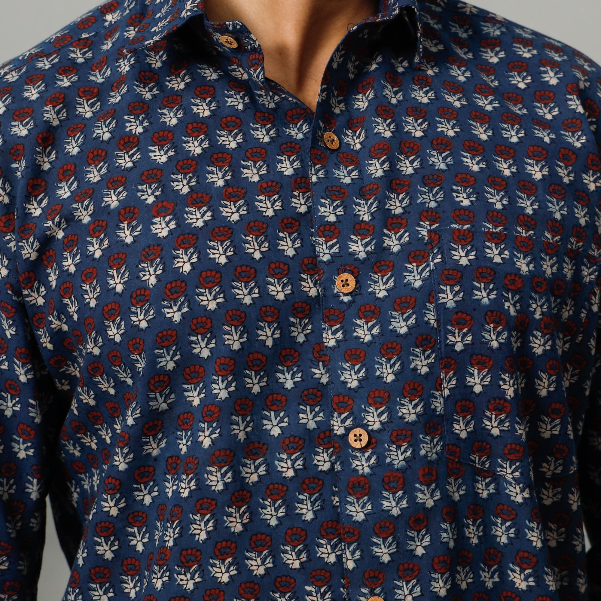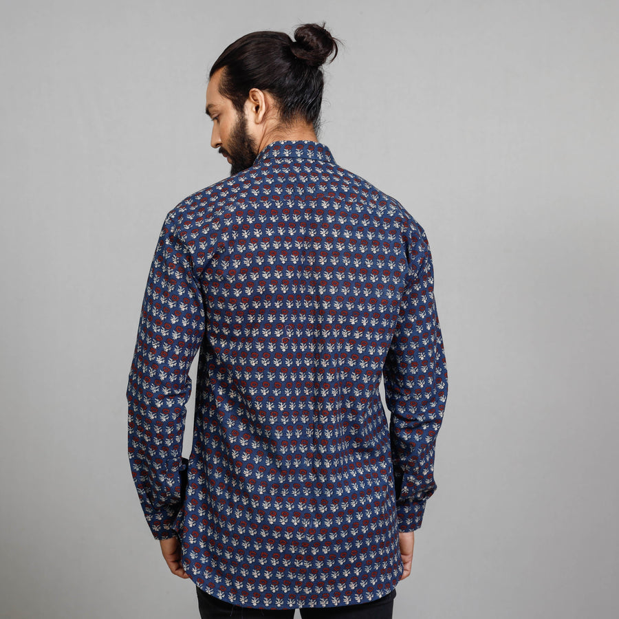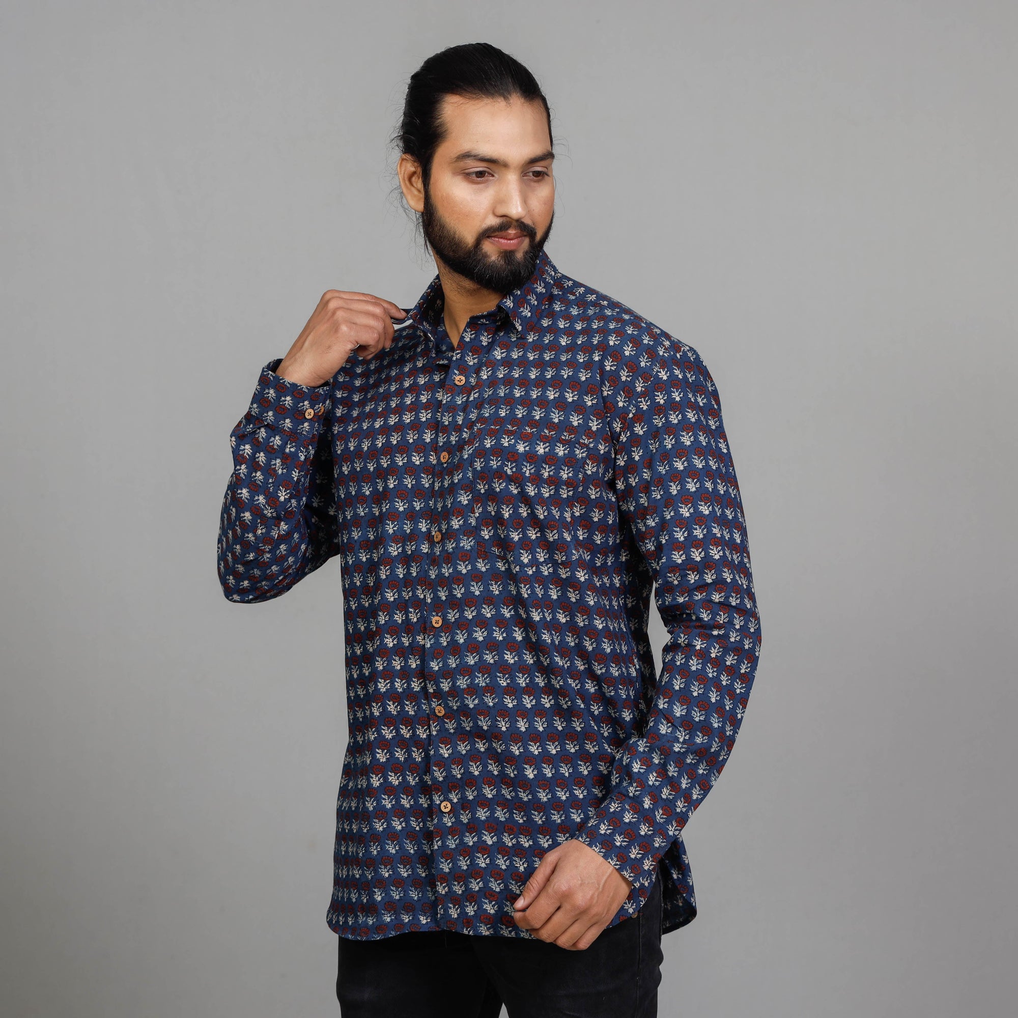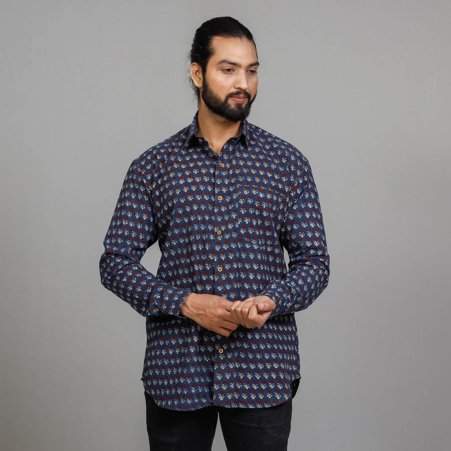 Fine quality ajrakh block printing cotton men full sleeve shirt. This shirt is made using natural dyes through the traditional ajrakh technique of hand block printing practised in the Kutch region of Gujarat. This shirt features a regular collar, full sleeves, crisp wooden buttons, and a patch pocket on the front. It is the perfect addition to your casual wardrobe.