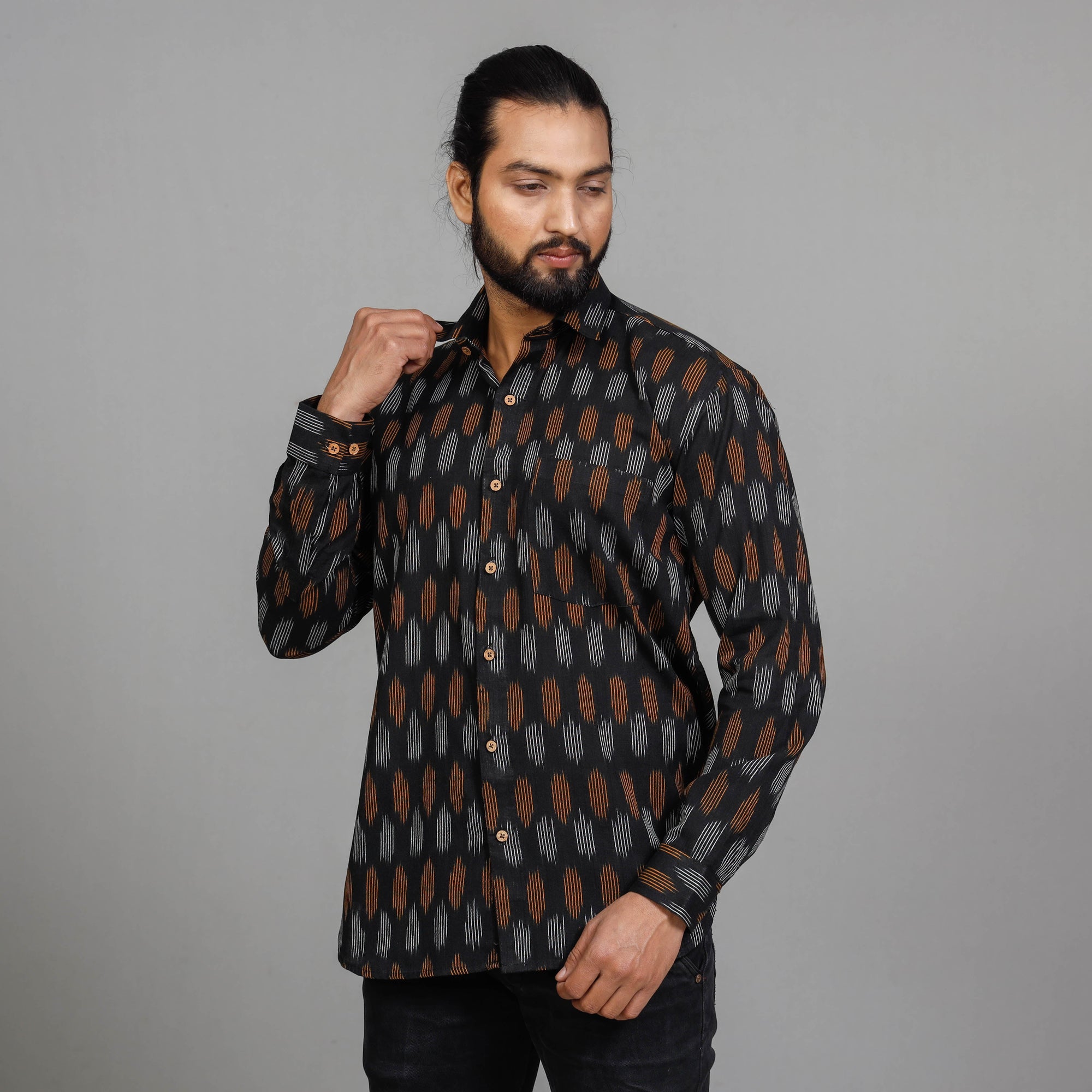 Fine quality pochampally ikat cotton men full sleeve shirt. This shirt features a regular collar, full sleeves, crisp wooden buttons, and a patch pocket on the front. It is the perfect addition to your casual wardrobe. Ikat (Ikkat) is a dyeing technique used to pattern textiles that employs a resist dyeing process similar to tie-dye on either the warp or weft fibres prior to dyeing. Ikat has lovely patterns and is world famous for its extremely beautiful colors, textures, and designs. Indian Ikat is always admired by fashion designers around the world.