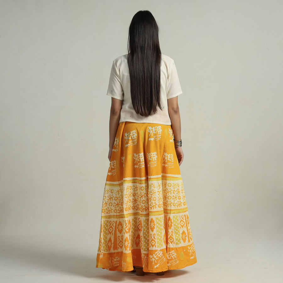 Fine quality yellow hand batik printed cotton long skirt designed with contemporary running stitch patterns. Batik is a technique of wax-resist dyeing applied to whole cloth, or cloth made using this technique. The traditional designs and motifs in Indian batik are often passed down from one generation to another. Super light weight.
