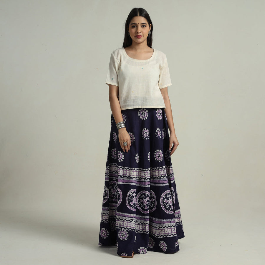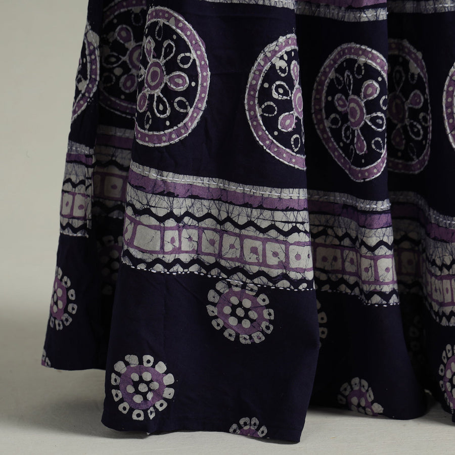 Fine quality blue hand batik printed cotton long skirt designed with contemporary running stitch patterns. Batik is a technique of wax-resist dyeing applied to whole cloth, or cloth made using this technique. The traditional designs and motifs in Indian batik are often passed down from one generation to another. Super light weight.